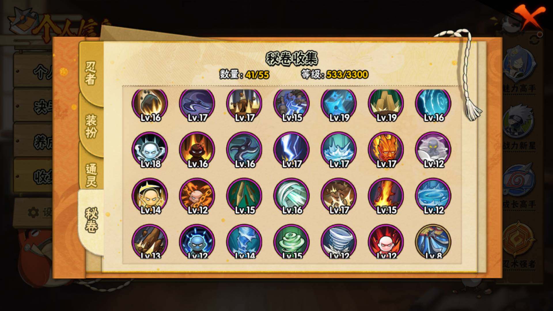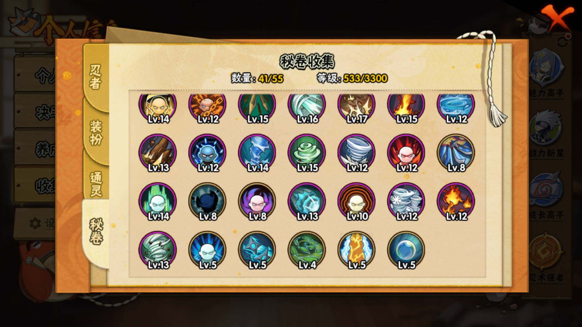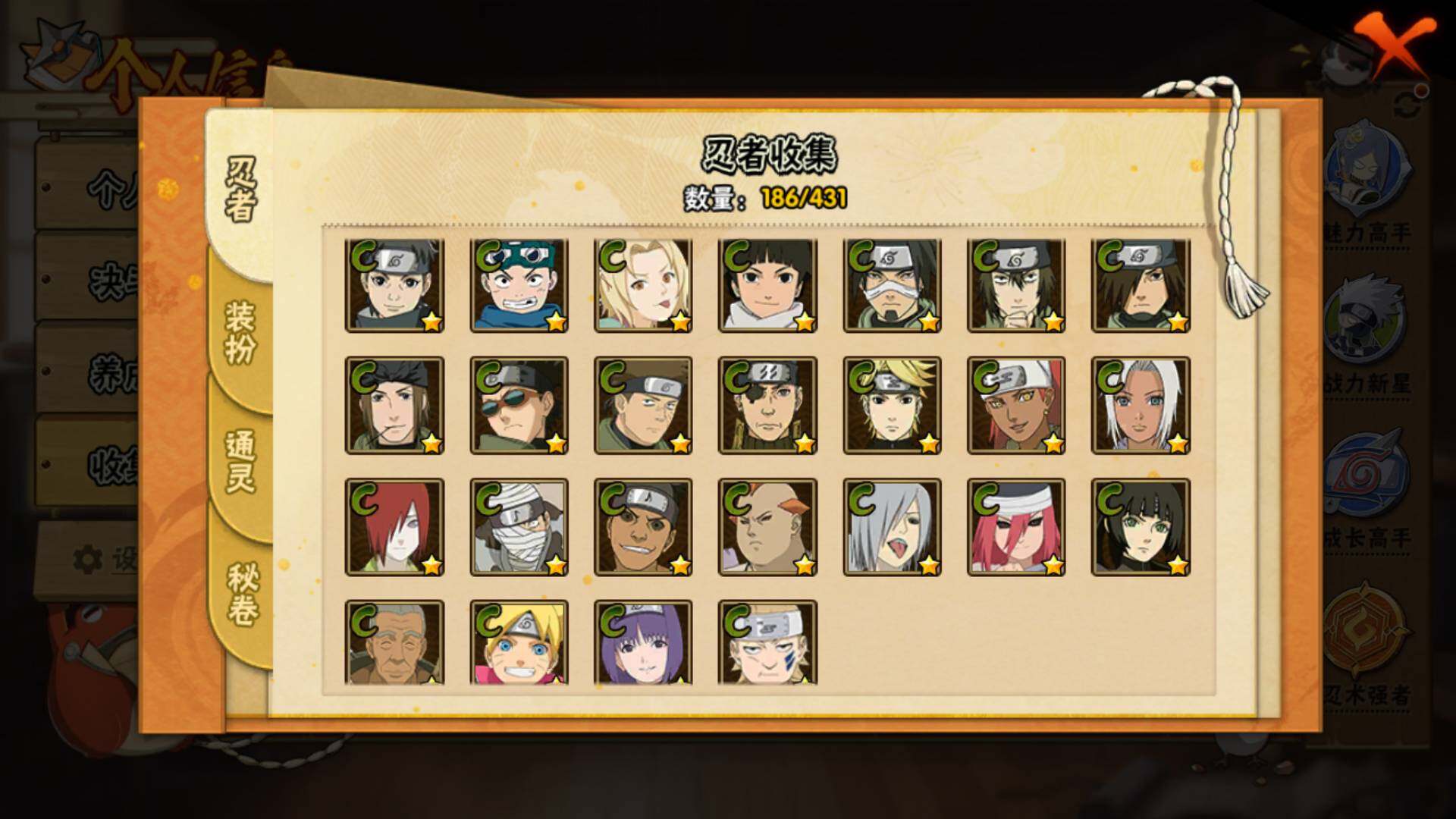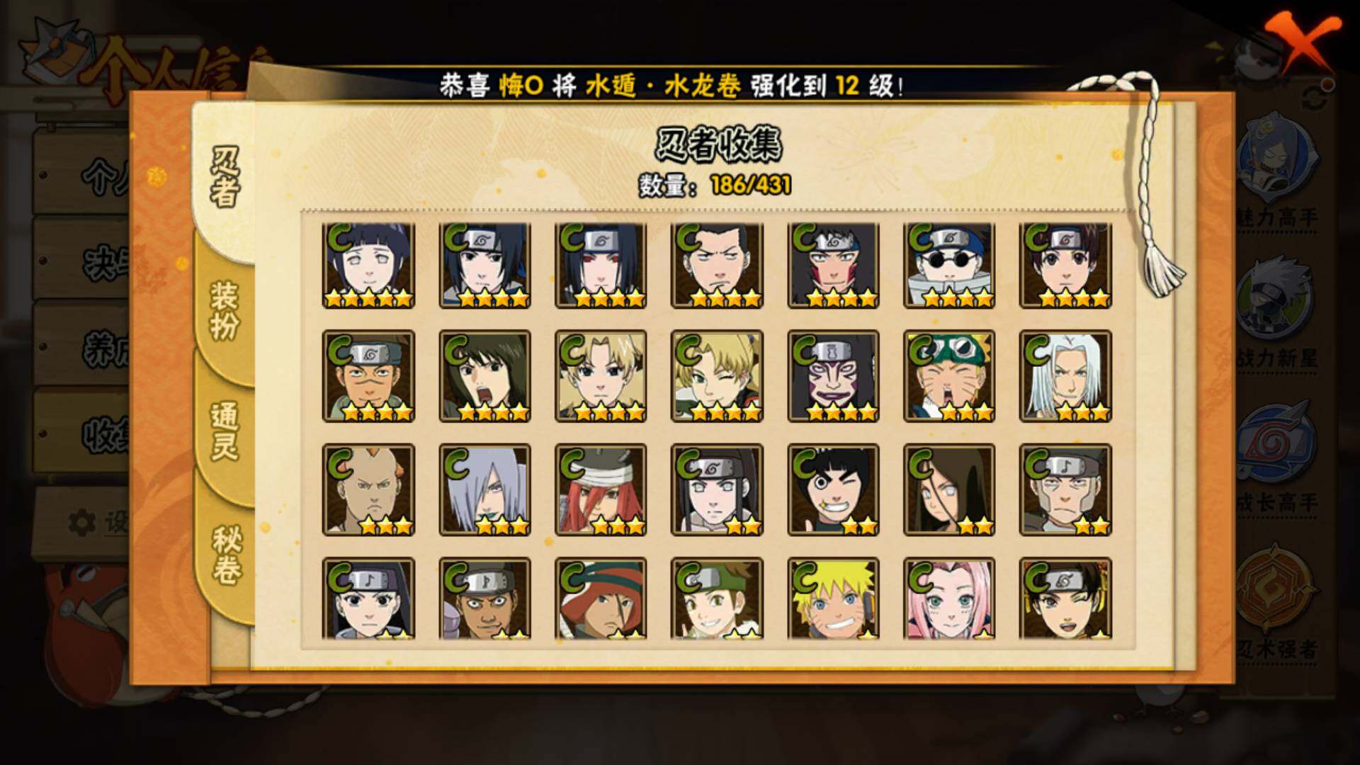 【S级忍者】:长门「秽土转生」(3星),千手柱间「秽土转生」(3星),宇智波斑「秽土转生」(3星),宇智波斑「秽土转生·解」(3星),宇智波带土「忍界大战」(3星),宇智波鼬「须佐能乎」(4星),旗木卡卡西「须佐能乎」(3星),自来也