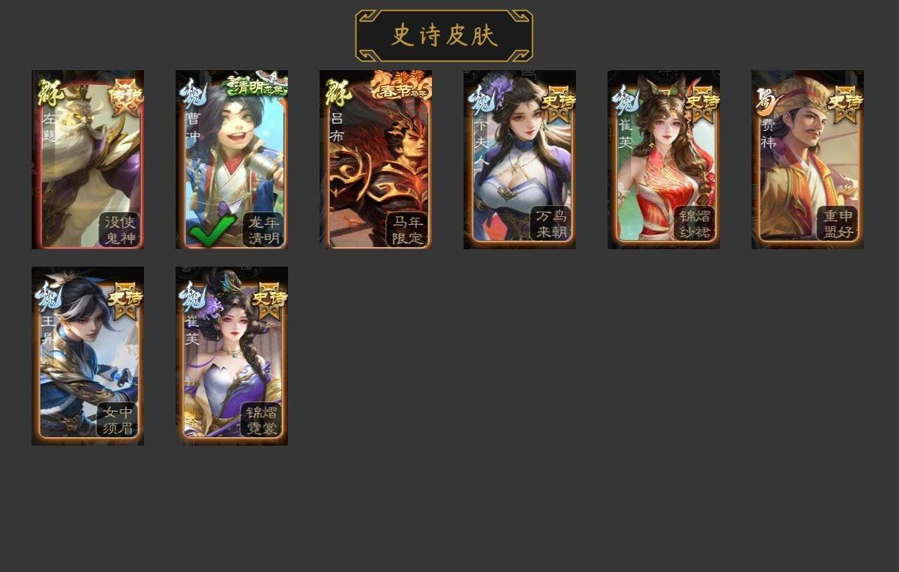 官阶:先锋将军;VIP等级:VIP1;史诗武将数量:5;动态皮肤数量:3;武将总数:169;史诗宝珠数量:0;将魂数量:201;神将:0;魏国史诗武将:2;蜀国史诗武将:1;吴国史诗武将:0;群史诗武将:3