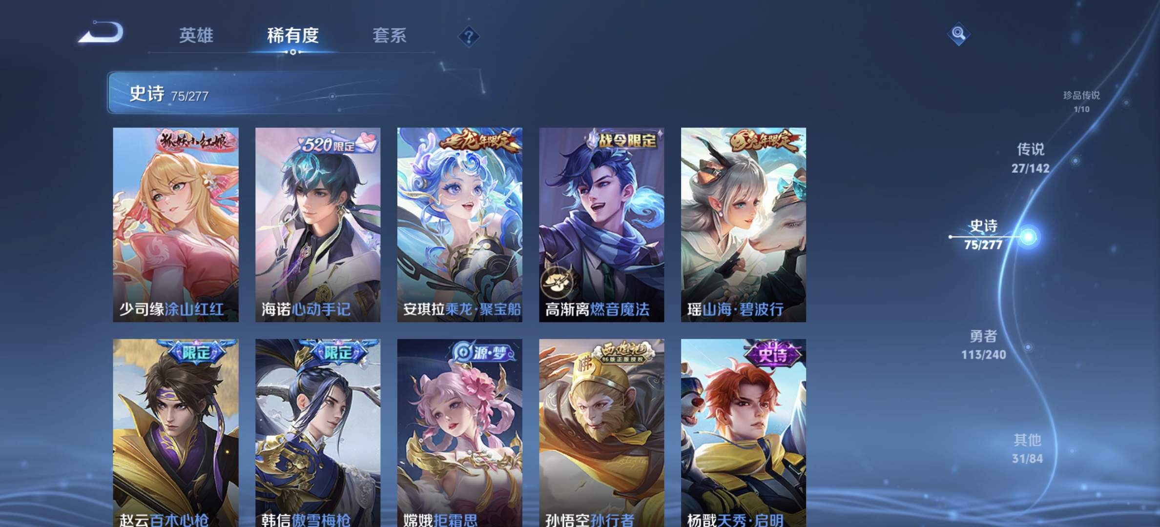 4无双1珍品27传说252皮肤1水晶2星元3金标3万战 129英雄