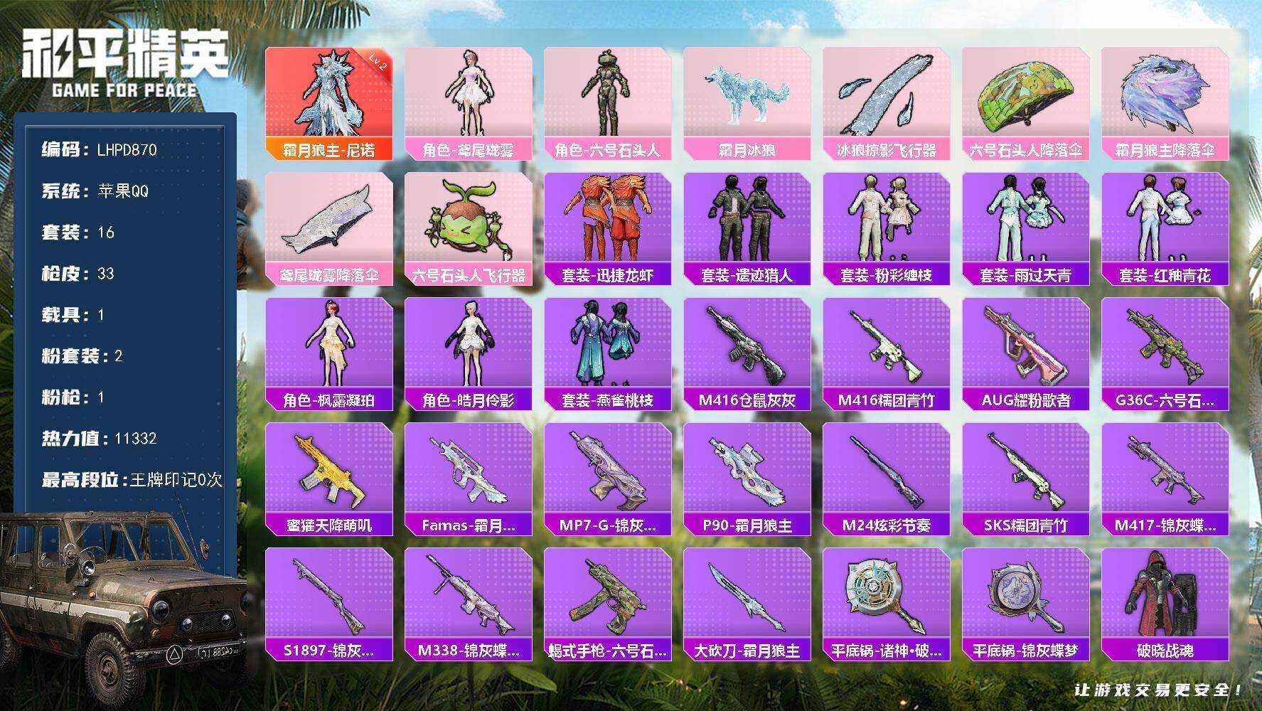 【极品竞氪狼主套】苹果 手Q-1神装-2粉装-1特效枪-1载具-2粉色飞行器-11332热力值-1王牌印记-16套装-33枪皮【红色神装等级】:霜月狼主-尼诺(二级)【红色角色神装】:霜月狼主-尼诺【粉色套装】:角色-鸢尾珑雾,角色-六号石头人【粉色载具】:霜月冰狼【粉色飞行器】:冰狼掠影飞行器,六号石头人降落伞