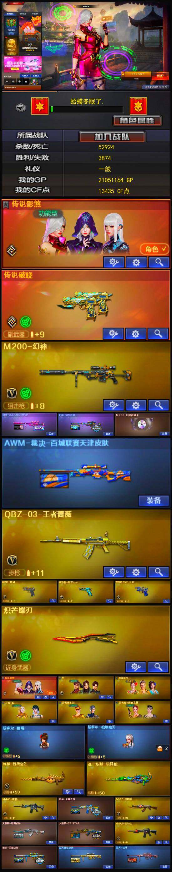 【ylw-cf2174】四川二区-32V-5王者-0炫金【传说武器】:传说破晓【传说角色】:传说影煞【热门武器】:传说破晓,M200-幻神,柯尔特-冠军之特,Cat-刀锋,牛牛-AK47,M4A1-黑骑士,斯泰尔-蝴蝶,USP-雷暴,炽芒蝶刃【音效卡】:M200-幻神音效卡【稀有皮肤】:幻神-冠军之幻,幻神-宠儿-2021MVP,雷神-荣耀之魄,火麒麟-轻羽皮肤,毁灭-暗月,毁灭-荣耀之怒,毁灭耀金皮肤【角色】:传说影煞,王者樱-热浪之夏,王者春,王者潘多拉,华【人偶武器】:斯泰尔-蝴蝶,海滩汪