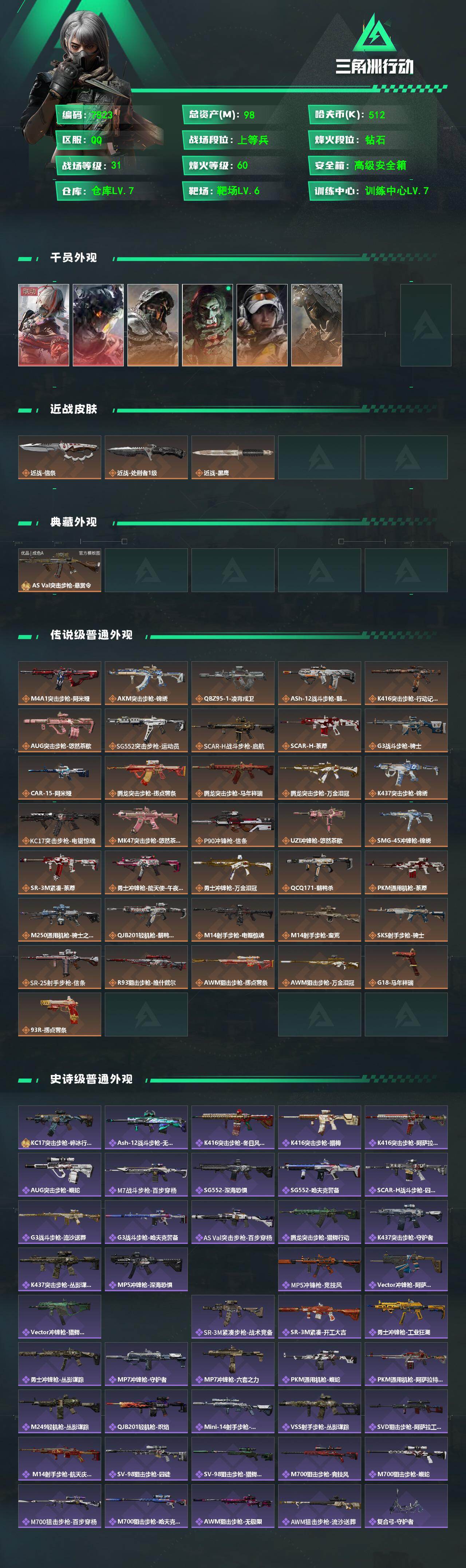 {特价出售}等级:60总资产:98.9M 纯币512398 隐藏挂饰: 2S统统拿走 红皮:凌霄戍卫 骇爪联动 刀皮: 信条 砖皮: AS悬赏令优品A 特勤处:仓库7,训练满,靶场6