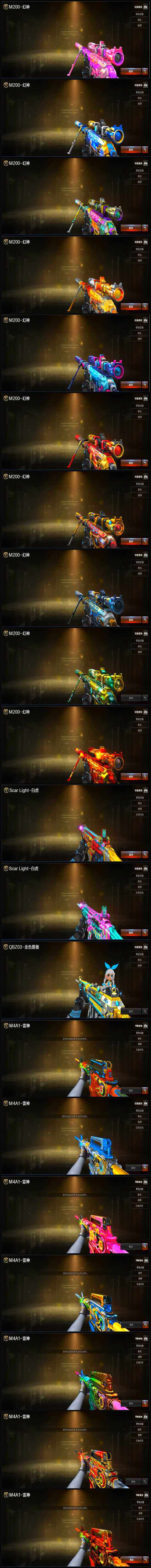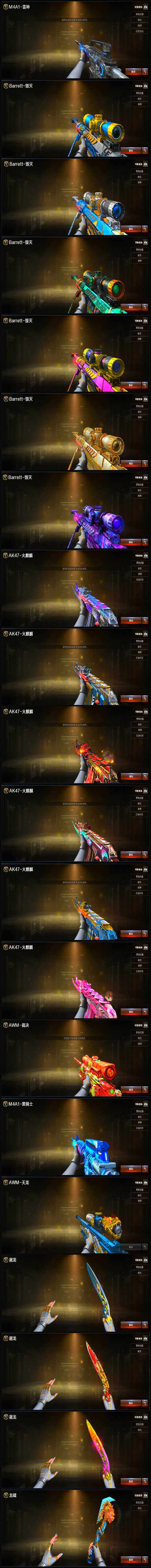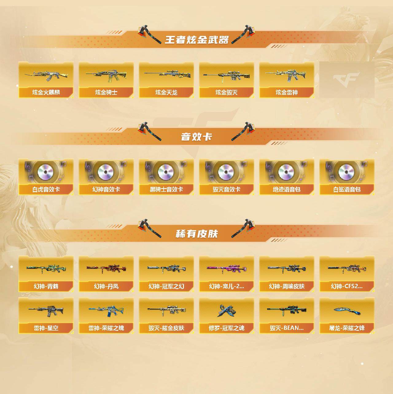 【热门武器】:传说辉光,QBZ03-金色蔷薇,Scar Light-白虎,M200-幻神*5,M200-竞技荣光,荣耀世冠-火麒麟,荣耀世冠-雷神,白虎-电玩蓝兔,柯尔特-冠军之特,荣耀世冠-柯尔特*2,C.A.T,牛牛-AK47,M4A1-黑骑士,汤姆逊-烈龙,加特林-炼狱,裁决-雪莉杨,火麒麟-绝迹,USP-雷暴,COP-堕天神,沙鹰-修罗*2,Knife-冠军之刃,荣耀世冠-龙啸