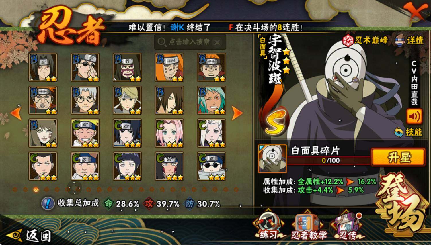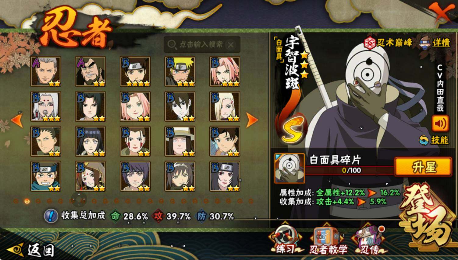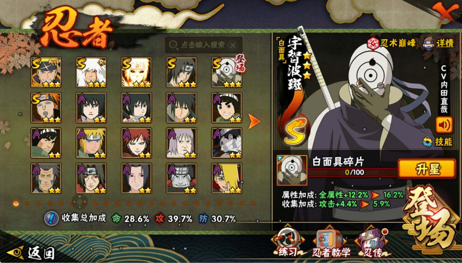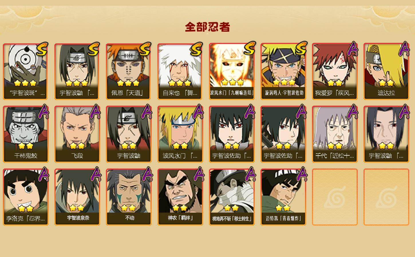 【S级忍者】:宇智波鼬「须佐能乎」(3星),自来也「舞之豪杰」(3星),佩恩「天道」(3星),宇智波斑 「白面具」(3星宇智波斑「白面具」),波风水门「九喇嘛连结」(3星),漩涡鸣人·宇智波佐助(3星)