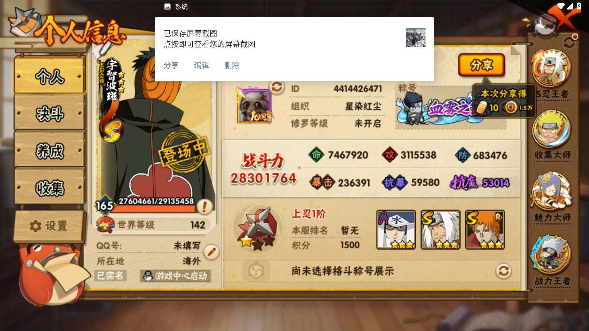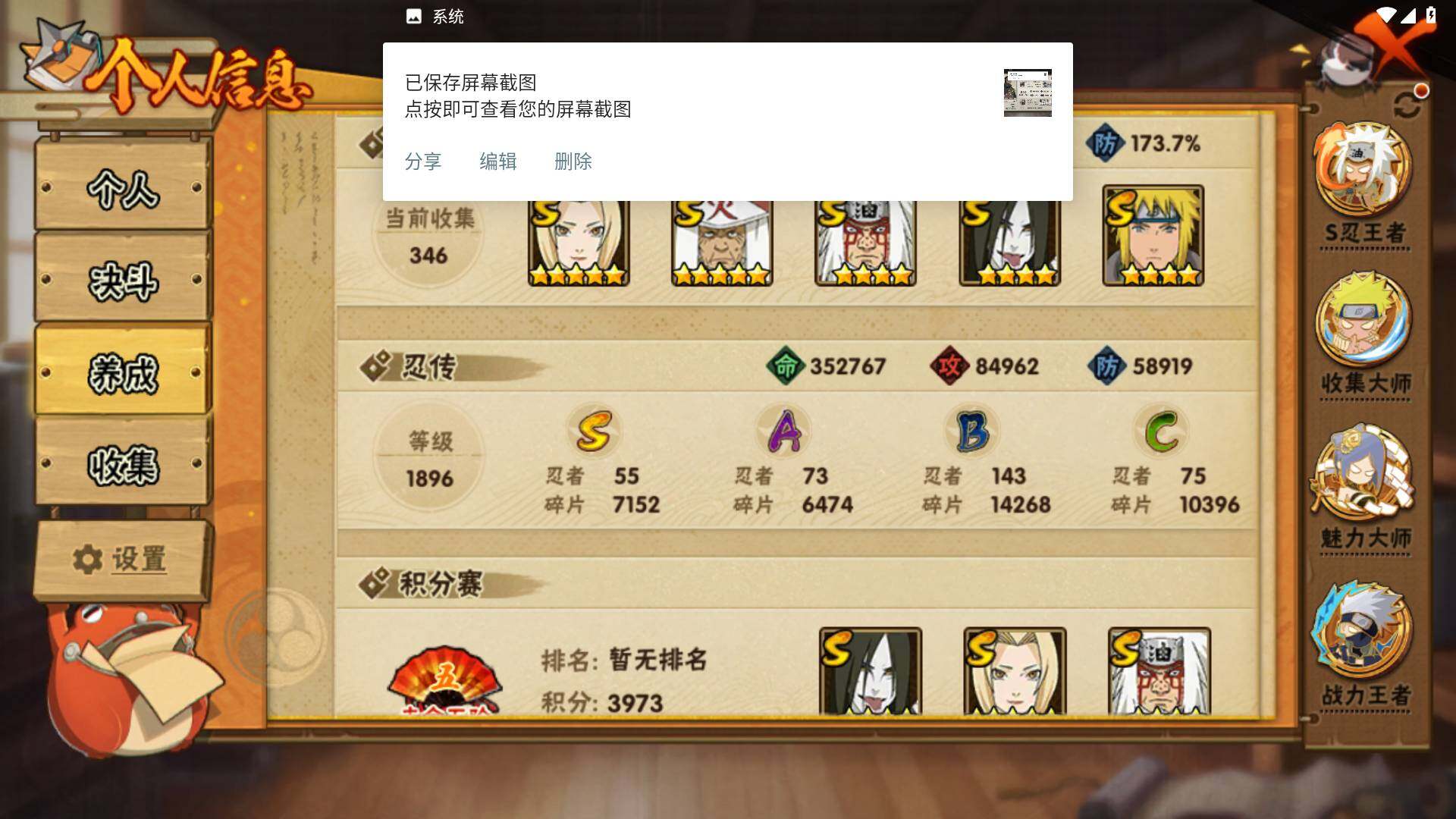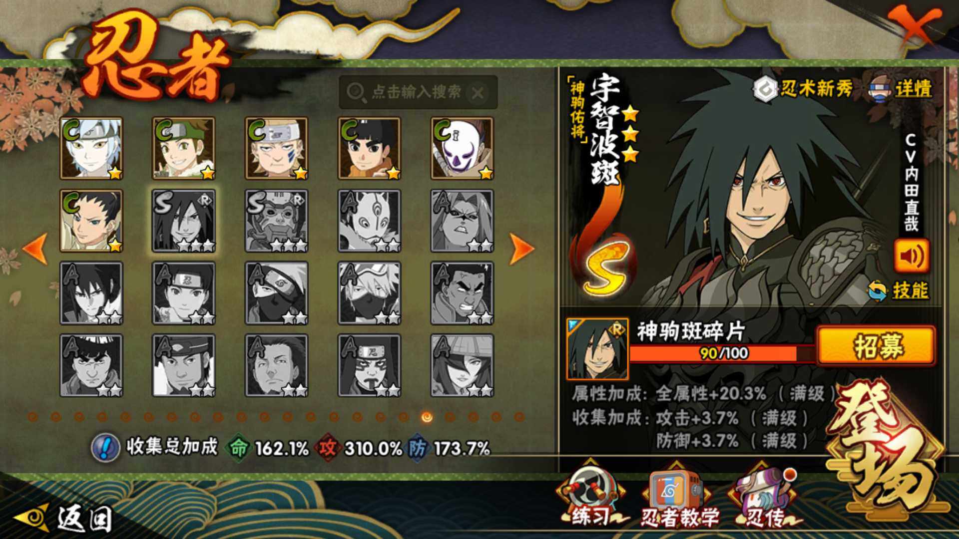 【S级忍者】:长门「秽土转生」(3星),三代目风影「秽土转生」(3星),金角·银角「秽土转生」(3星),猿飞日斩「秽土转生」(3星),波风水门「秽土转生」(3星),千手扉间「秽土转生」(3星),千手柱间「秽土转生」(3星)
