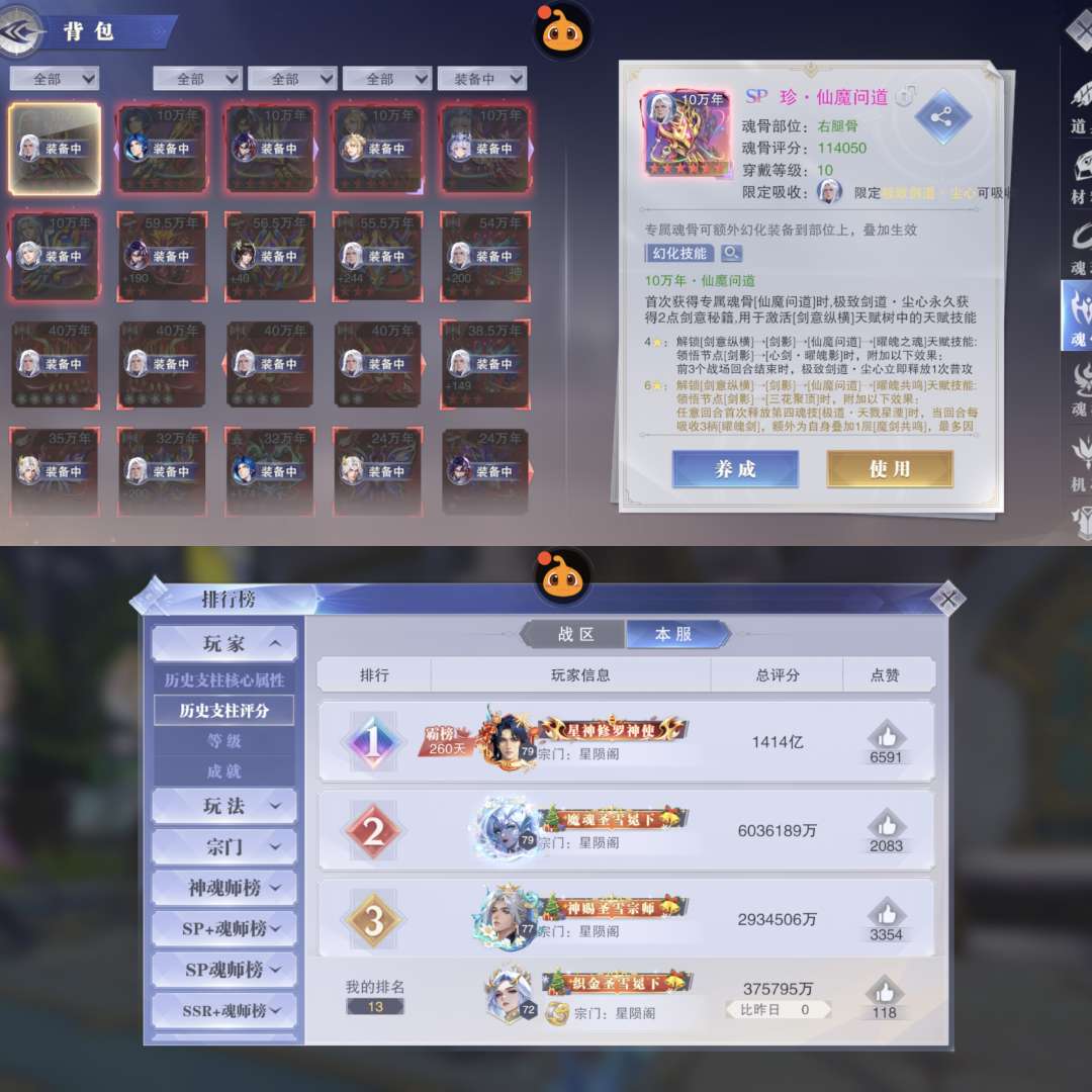 47亿战力。72级。红5神雪24sp。彩1大荣。彩5剑仙。业火神诏双神。千秋劫 万壑松风剑仙。黑皮