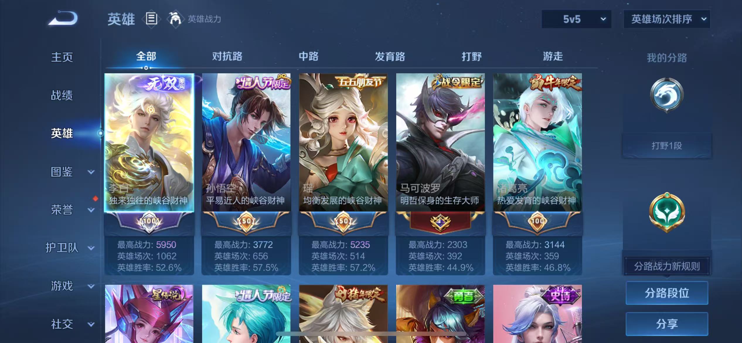 绝世王者/302皮肤/129英雄/1典藏/0珍品无双/1无双/1珍品传说/14传说/84史诗/9稀有英雄
