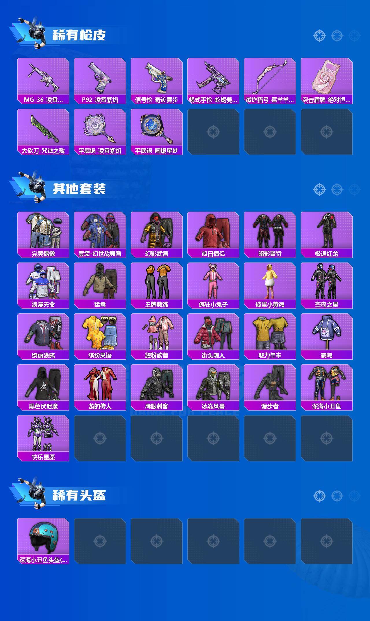 精品小号【特价出售/店主推荐--热门套装浪漫天命小丑鱼哥特】苹果 手Q-4粉装-3特效枪-3载具-2粉色飞行器-28744热力值-1王牌印记-62套装-95枪皮【热门品类】:套装-浪漫天命,套装-深海小丑鱼,套装-暗影哥特【粉色套装】:角色-绝对恒星,角色-绯穹魔姬,粉装-极意拳锋,角色-罪夜之冕【粉色枪皮等级】:UMP45-萌骑冒险(五级),Kar98K-巳巳如意(五级),DP-28-豹影疾电