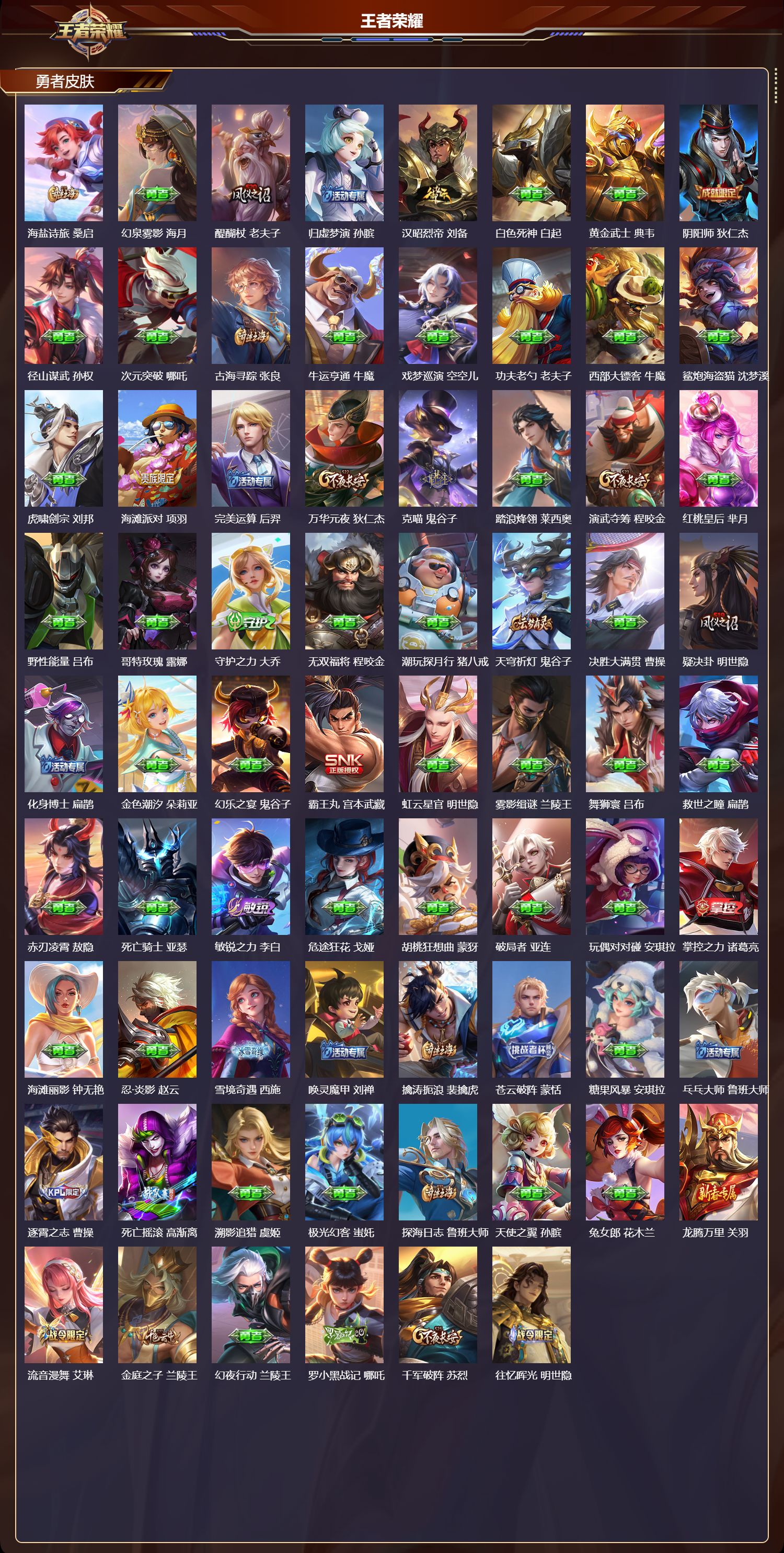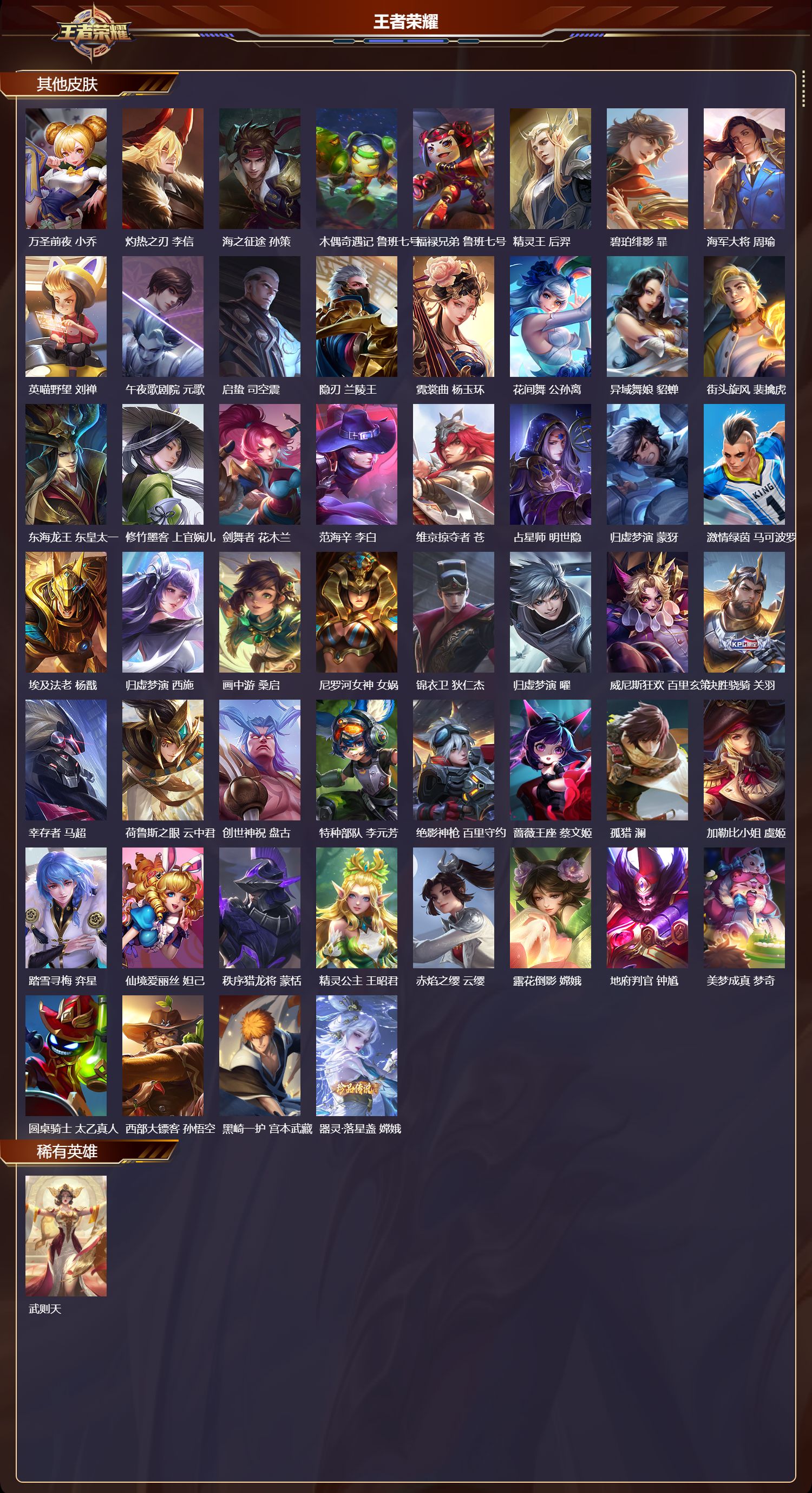 安卓QQ/传奇王者/326皮肤/129英雄/0典藏/0珍品无双/5无双/2珍品传说/27传说/91史诗/9稀有英雄【2 珍品传说】黑崎一护 宫本武藏,器灵·落星盏 嫦娥,【5 无双皮肤】雪境奇遇 甄姬,碎月剑心 李白,真我赫兹 瑶,离恨烟 公孙离,神罪 铠,【27 传说皮肤】星穹之声 王昭君,启明星使 虞姬,纵目迁山 杨戬,白虎志 百里玄策,补天 女娲,永曜之星 杨戬,神骥·赴朔漠 狄仁杰,神骥·