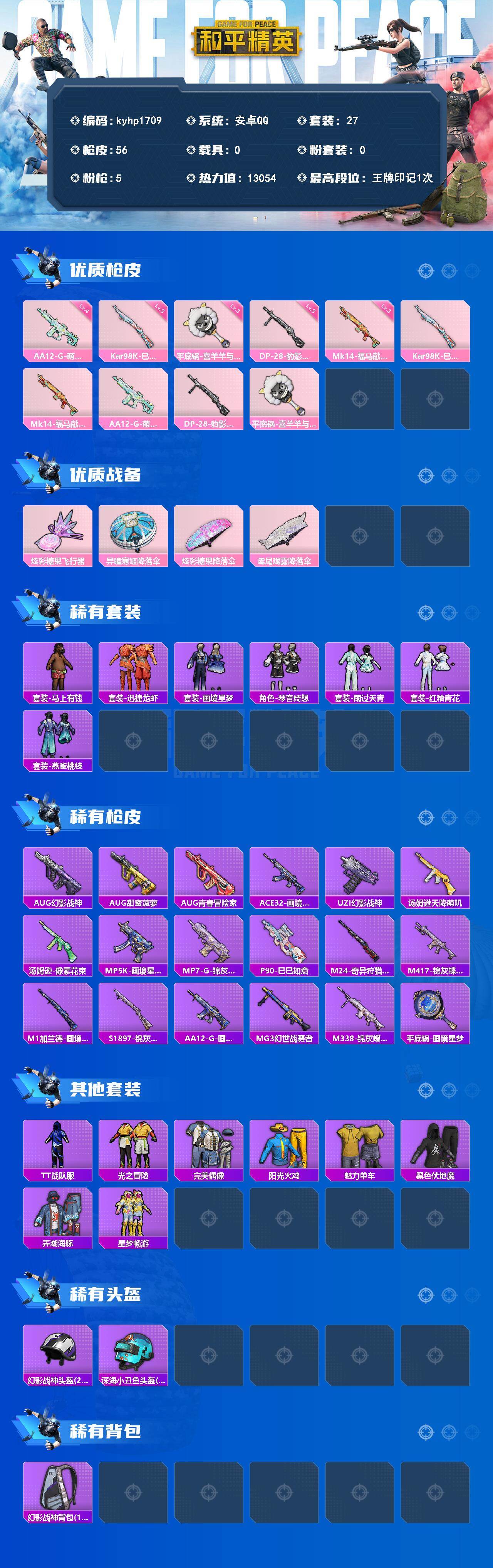 安卓 手Q-0粉装-5特效枪-0载具-1粉色飞行器-13054热力值-1王牌印记-27套装-56枪皮