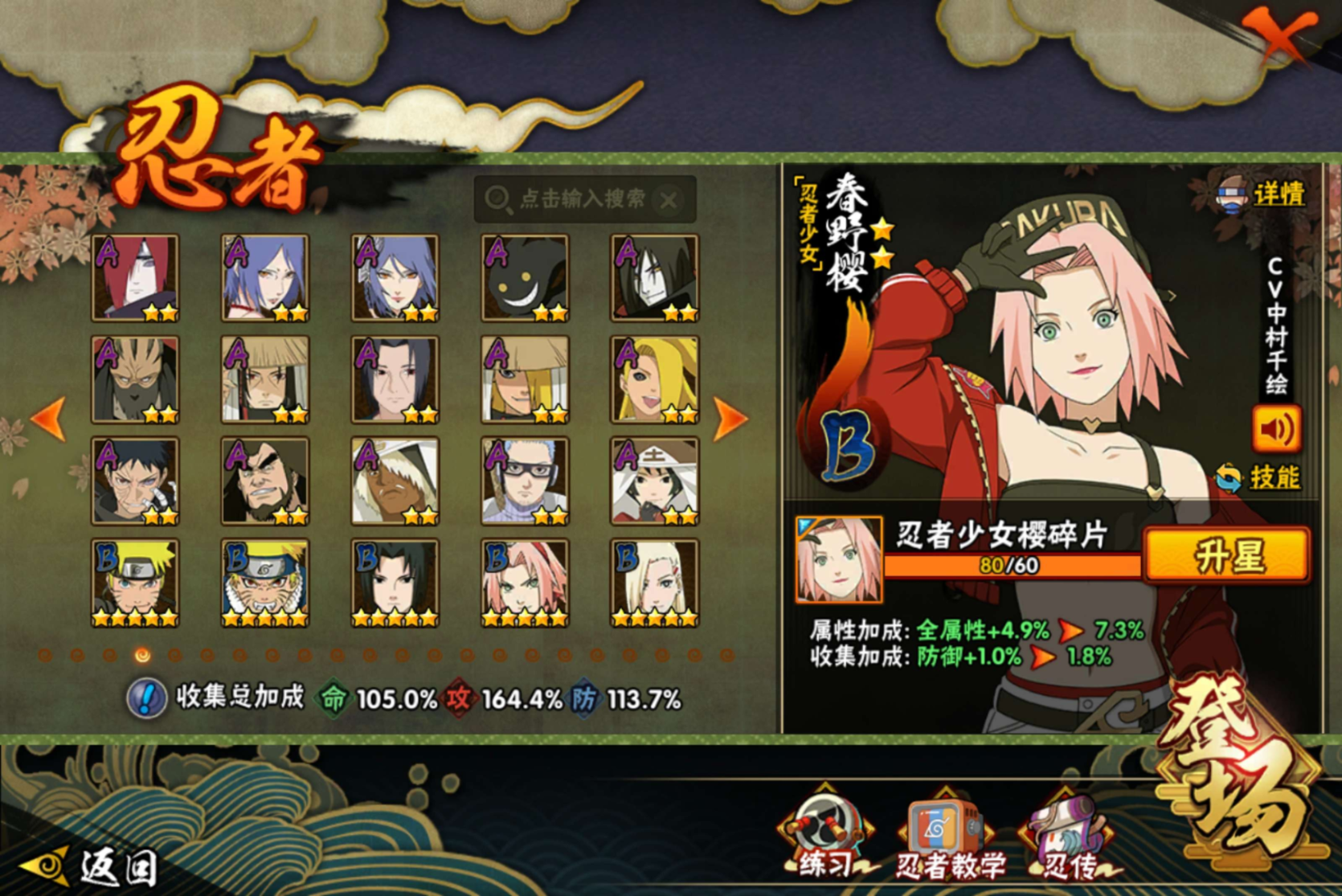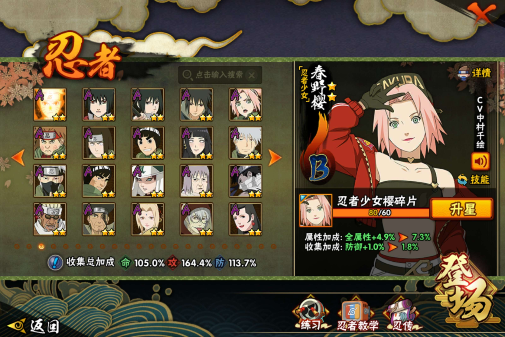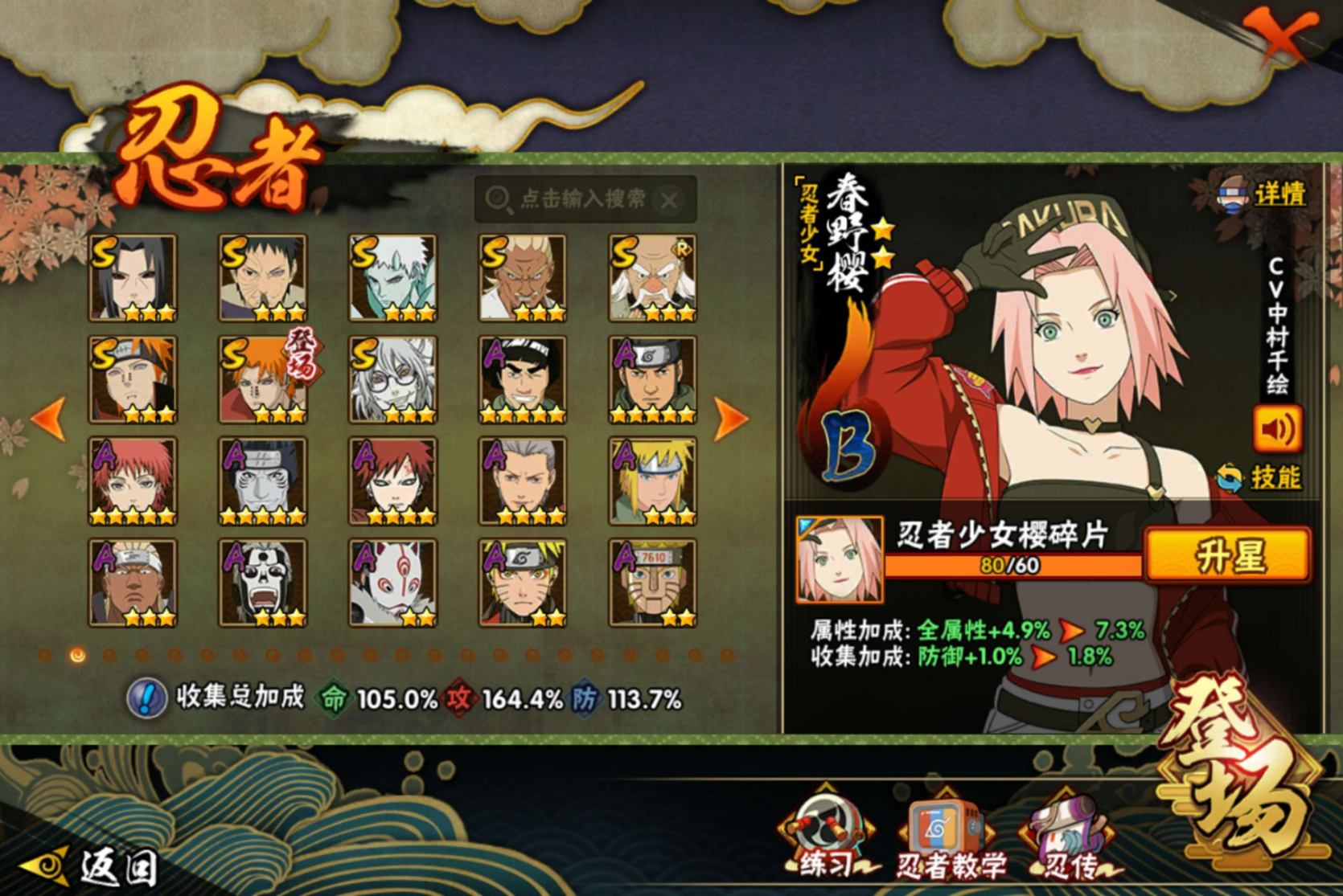 【S级忍者】宇智波带土「忍界大战」(3星),宇智波斑「木叶创立」(3星),迈特凯「死门」(3星),大野木「忍界大战」(3星),自来也「传说中的三忍」(3星),漩涡鸣人「暴