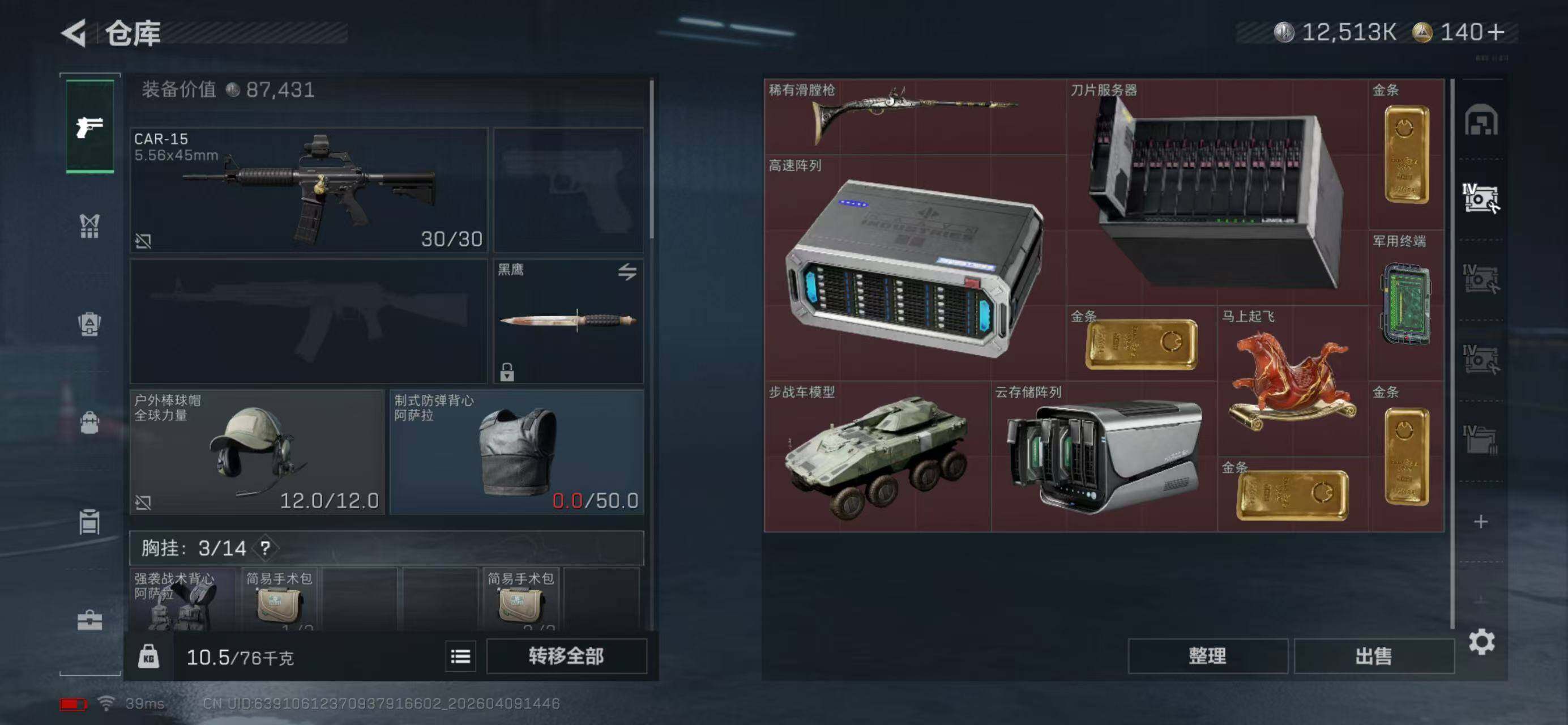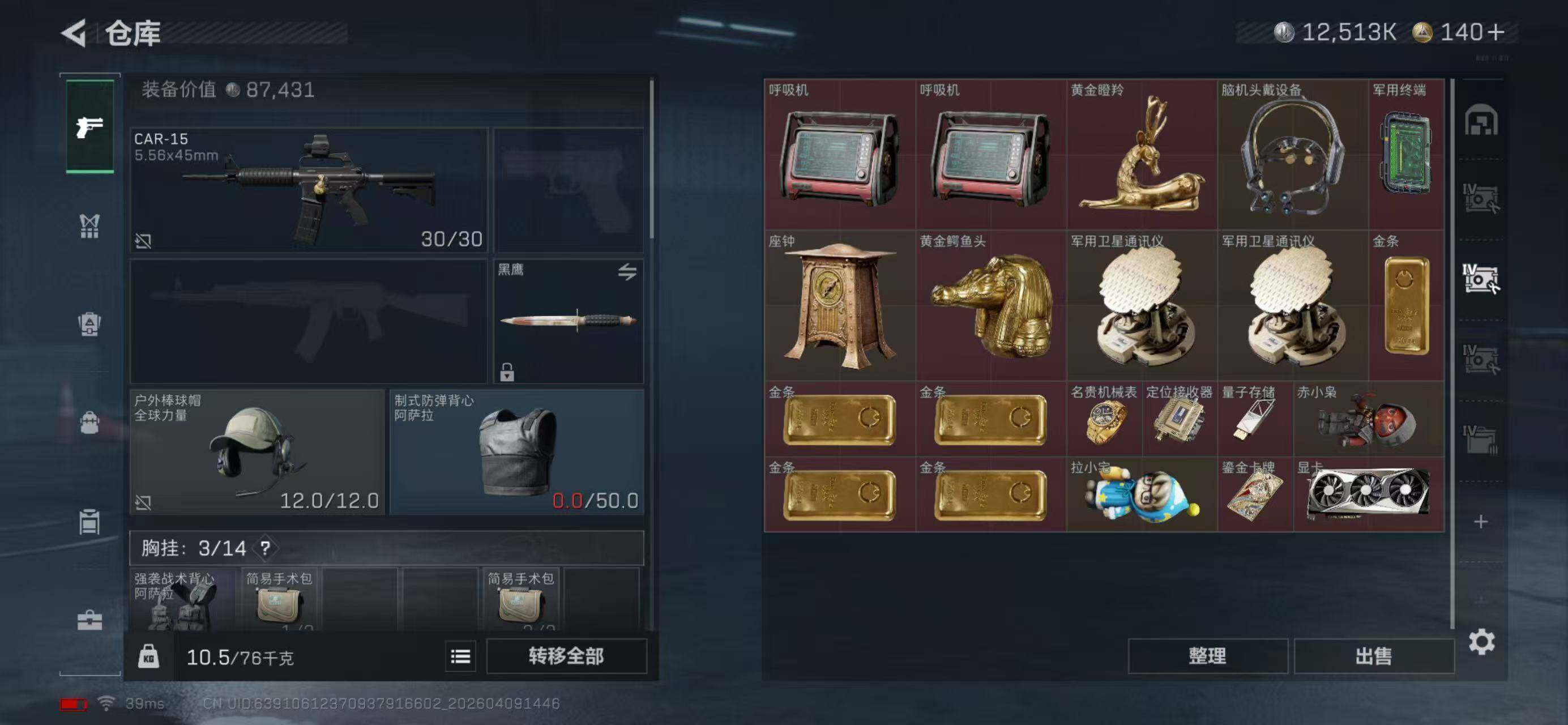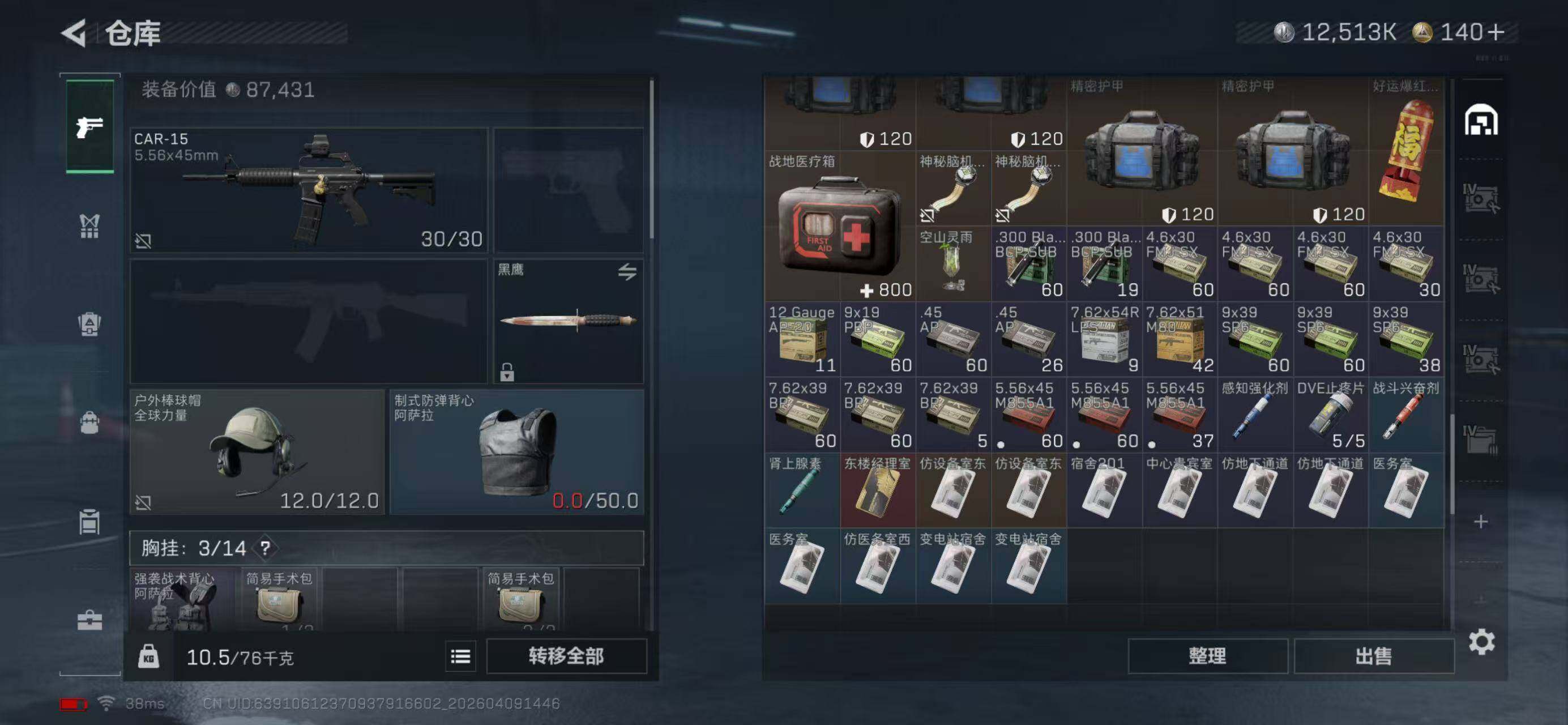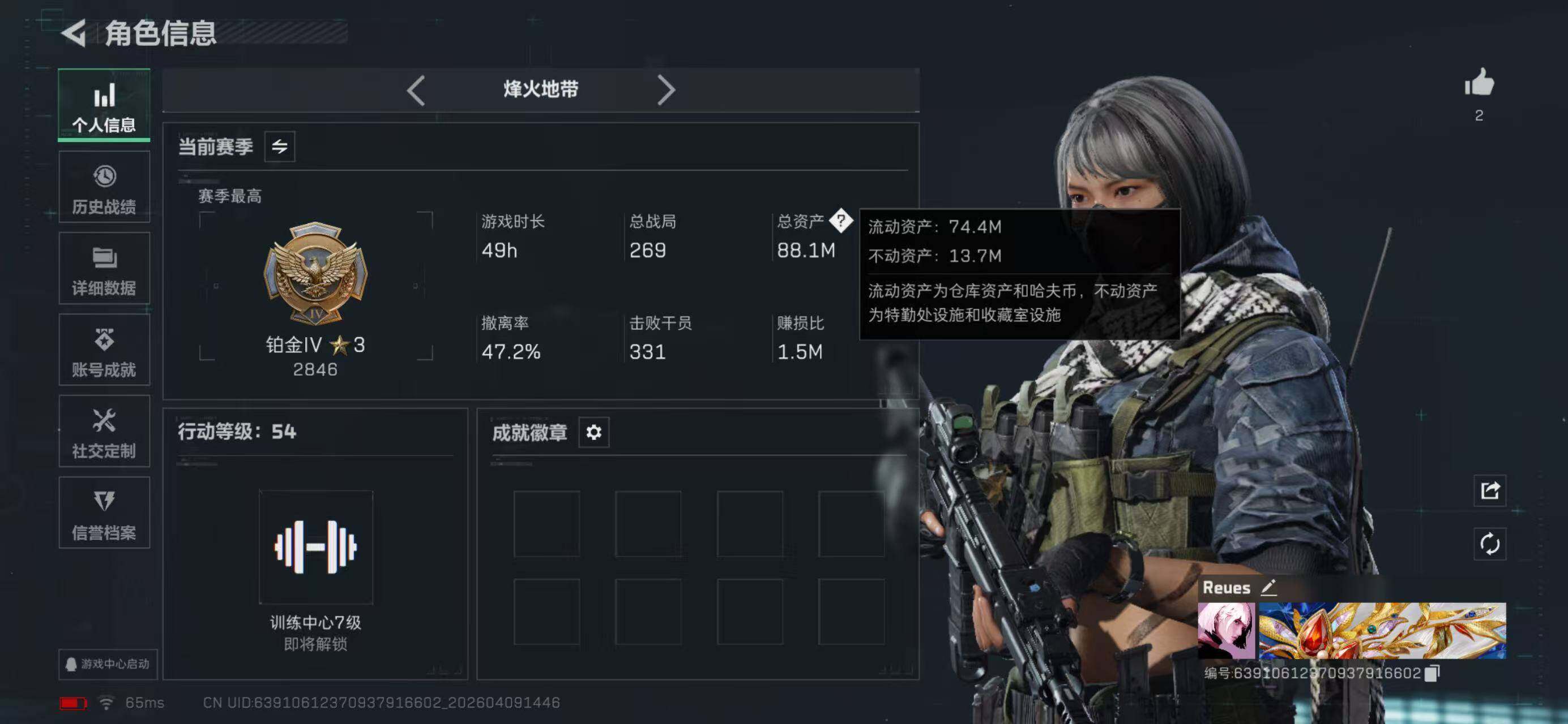 88m总资产-12513k哈夫币-54烽火等级-铂金-1战场等级-无军衔
