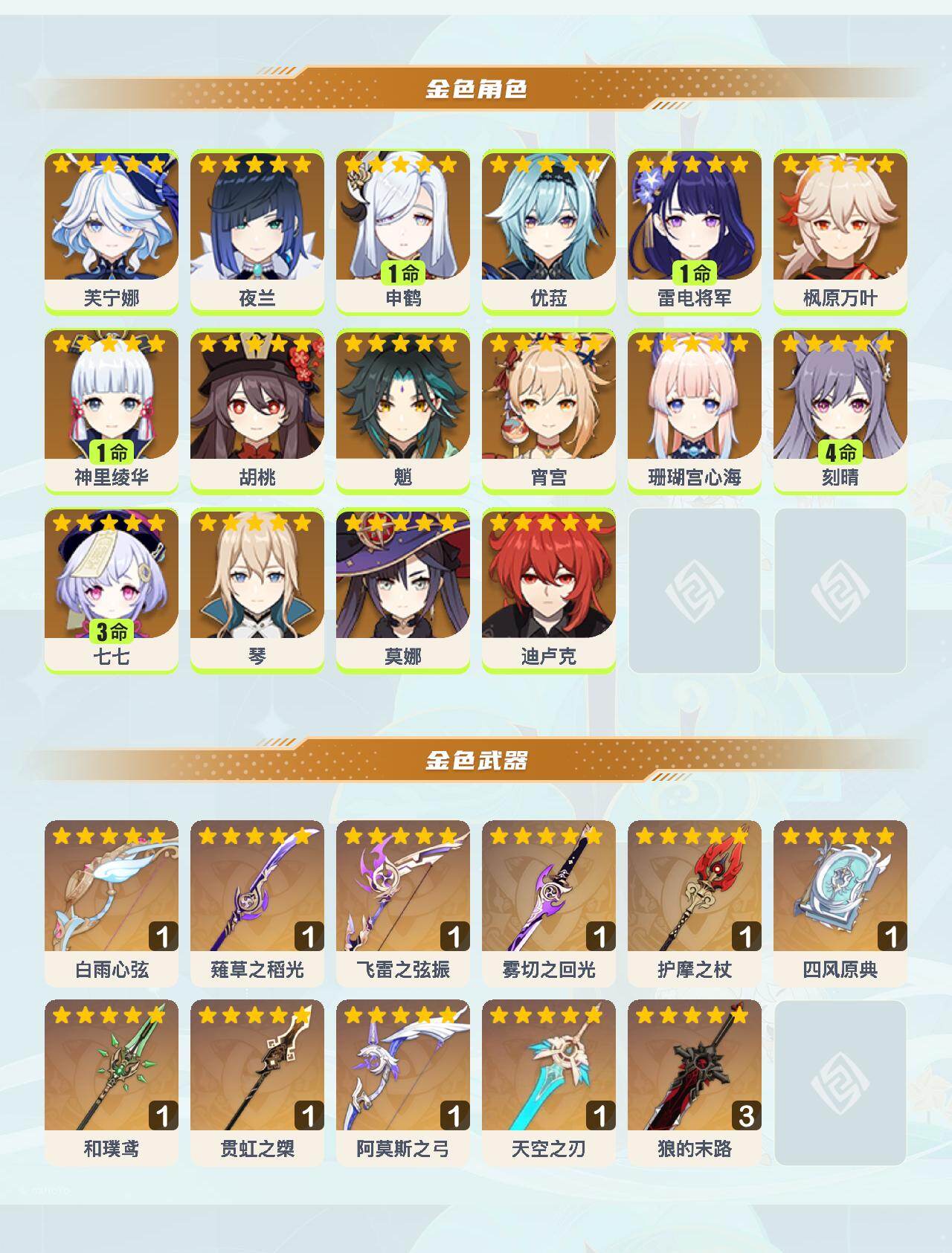 【YSYT1158】58级/40黄/女主/16个五星角色/12个五星武器/1命神里绫华/1命申鹤/枫原万叶/珊瑚宫心海/魈/优菈/1命雷电将军/夜兰/宵宫/胡桃/4命刻晴/芙宁娜/莫娜/3命七七/琴/迪卢克/飞雷之弦振/阿莫斯之弓/四风原典/薙草之稻光/和璞鸢/贯虹之槊/护摩之杖/精3狼的末路/雾切之回光/天空之刃/白雨心弦