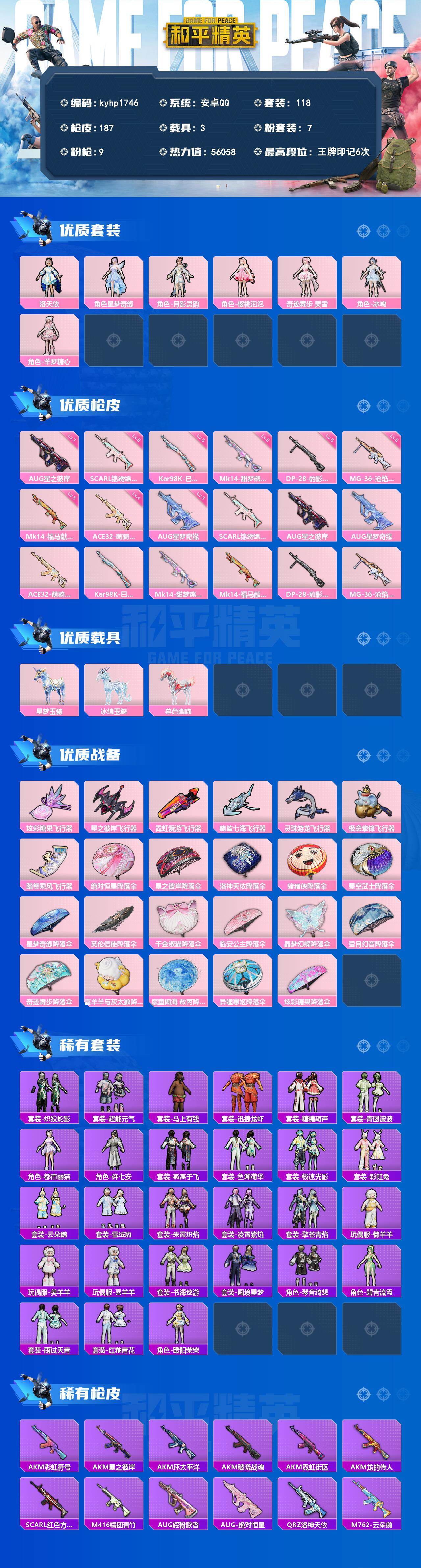 安卓 手Q-7粉装-9特效枪-3载具-7粉色飞行器-56058热力值-6王牌印记-118套装-187枪皮