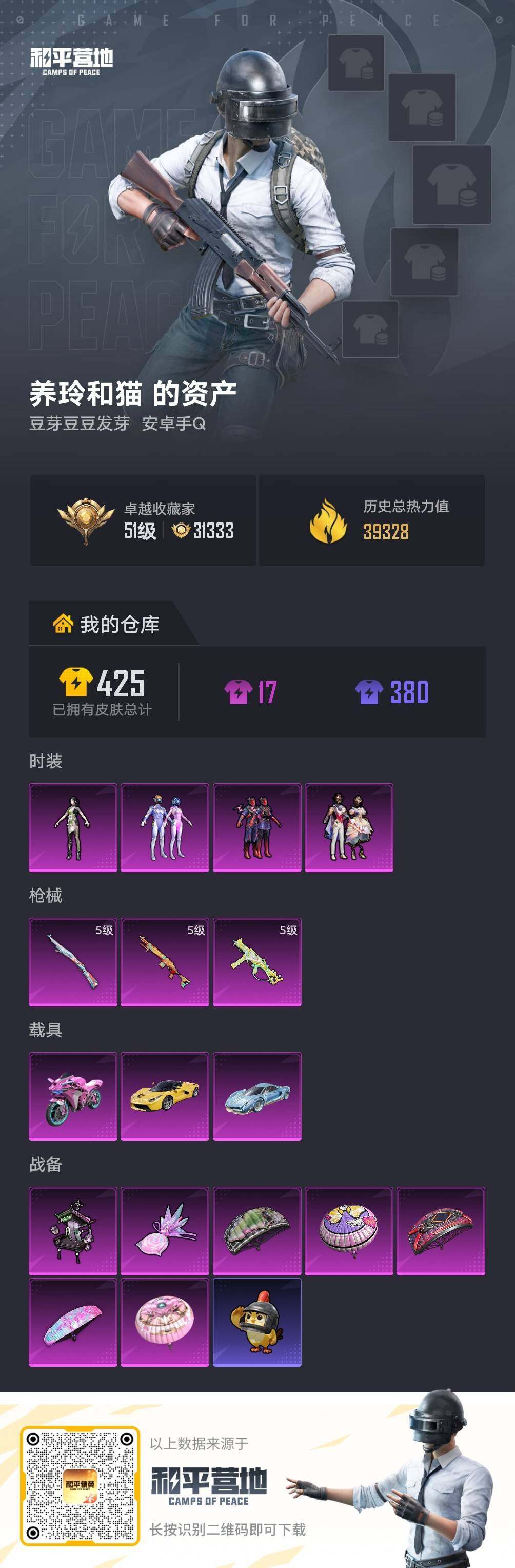 4粉装-3特效枪-3载具-2粉色飞行器-39328热力值-1王牌印记-70套装-124枪皮