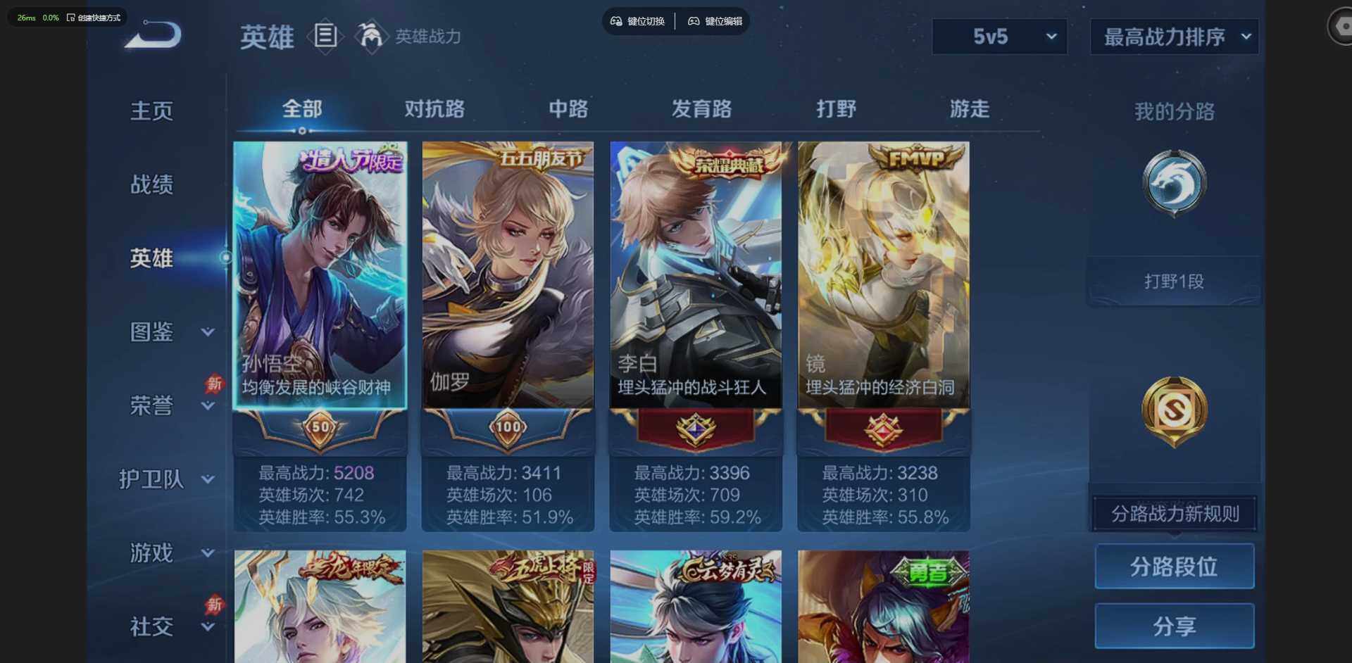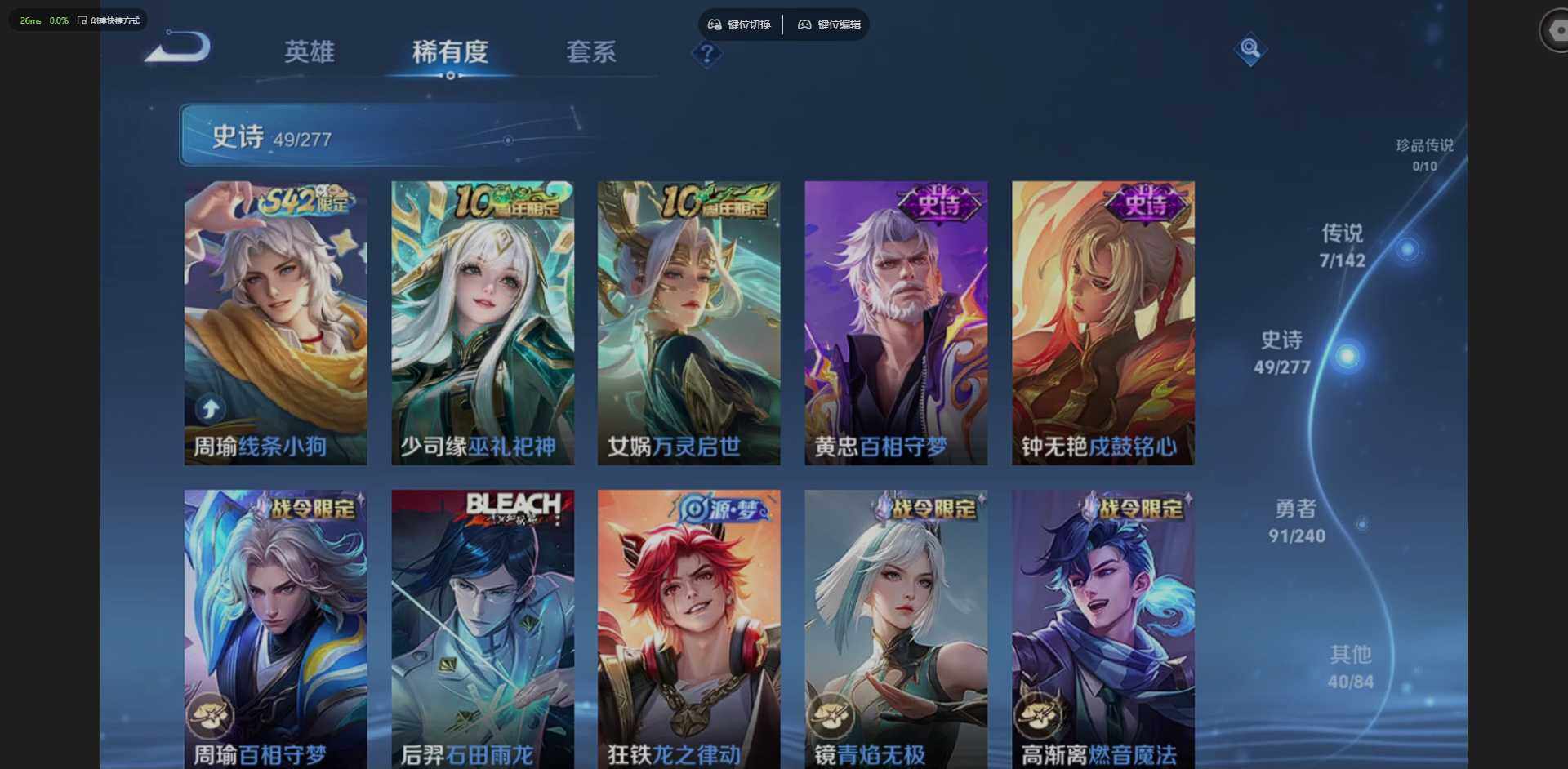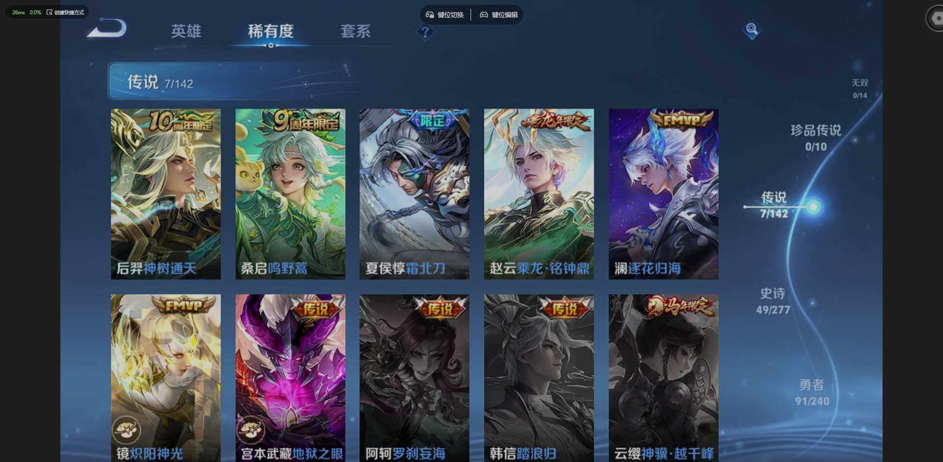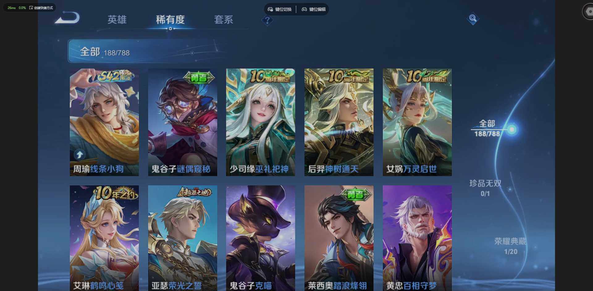 实名: 可修改 贵族等级: V7 英雄数: 128 皮肤数: 188 荣耀水晶