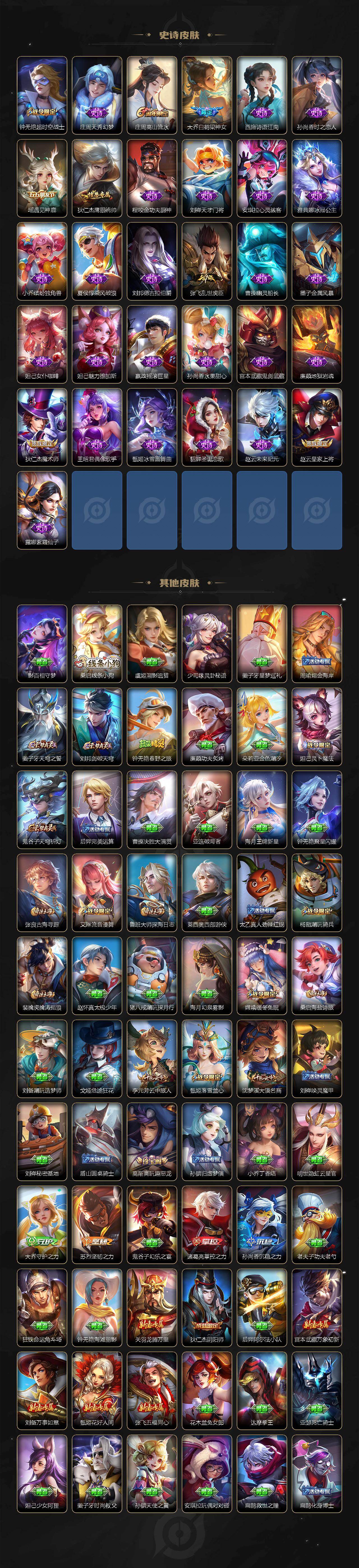 【限定皮肤】:姜子牙天穹之誓,狄仁杰阴阳师,赵云皇家上将,鲁班七号寅虎瑞焰,庄周高山流水,高渐离玩趣恶龙,钟无艳超时空战士,扁鹊奇幻香踪,元歌无心,甄姬落雪兰心,甄姬至美化雀舞,马可波
