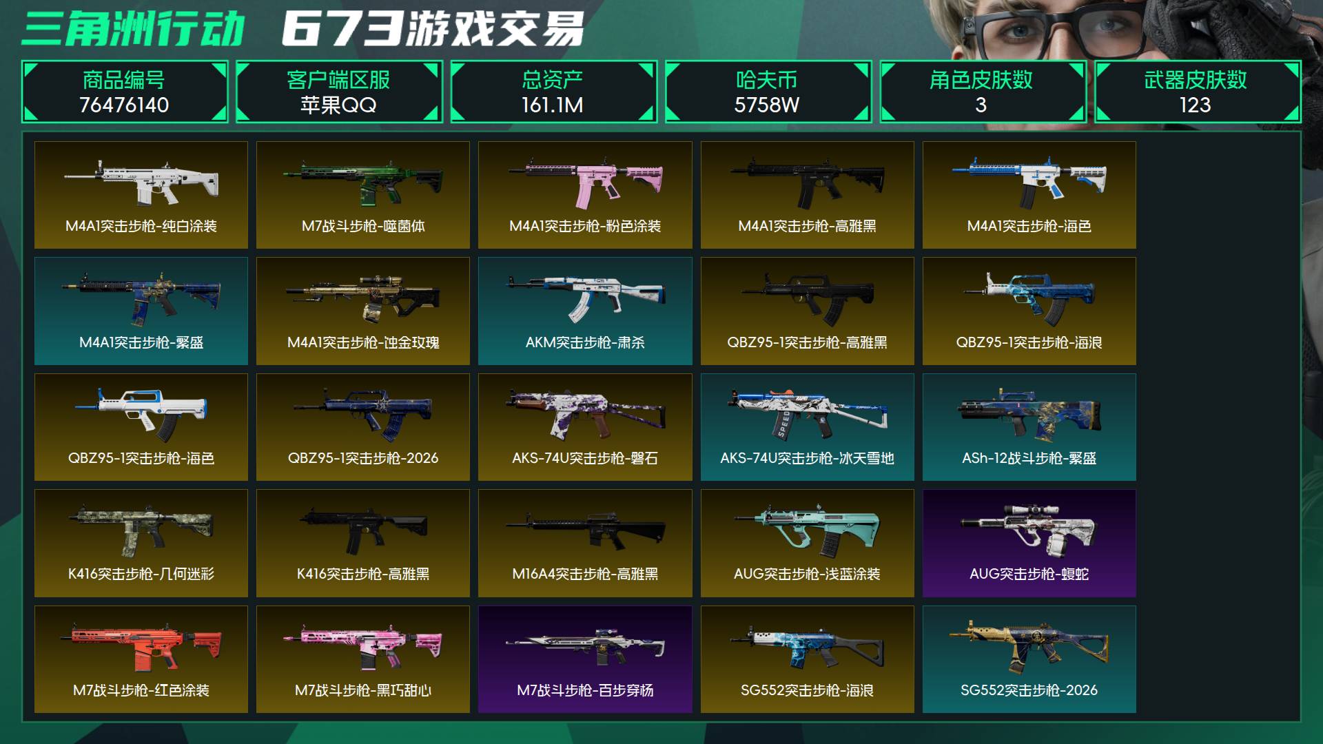 总资产:161M,哈夫币:5700W,传说武器22,史诗武器22,武器皮肤130