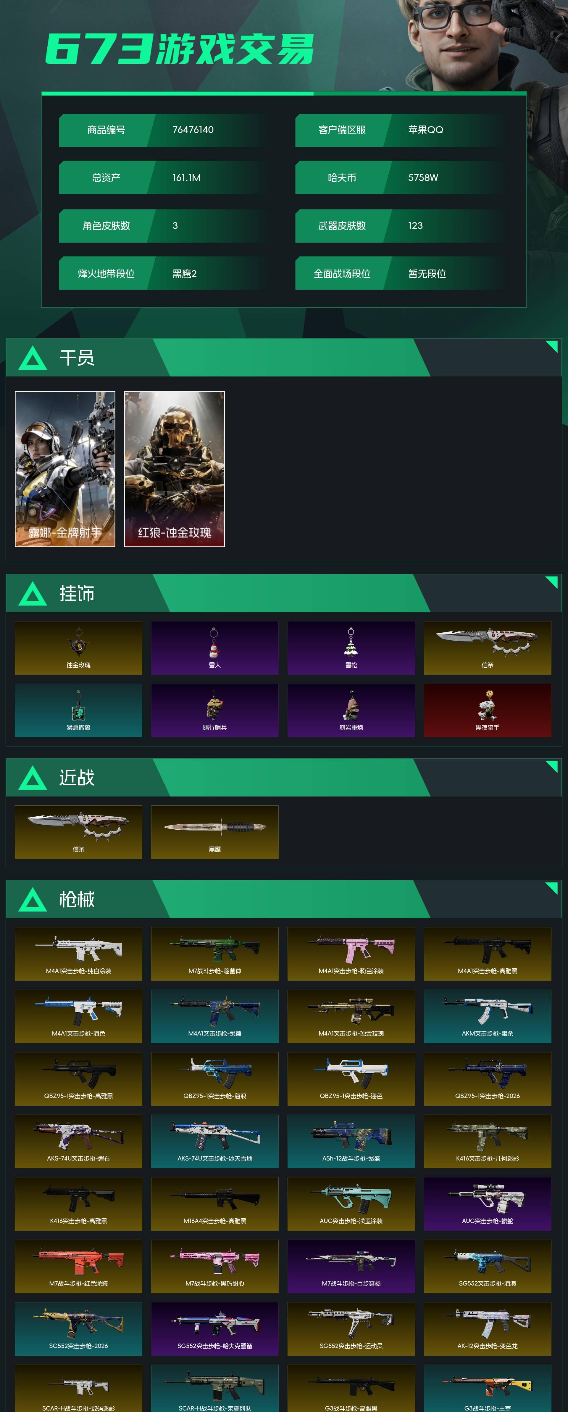 烽火段位黑鹰2 战场段位暂无段位 总资产161.1M 哈夫币5758W 干员3 挂饰19 近战2 枪械123 载具9