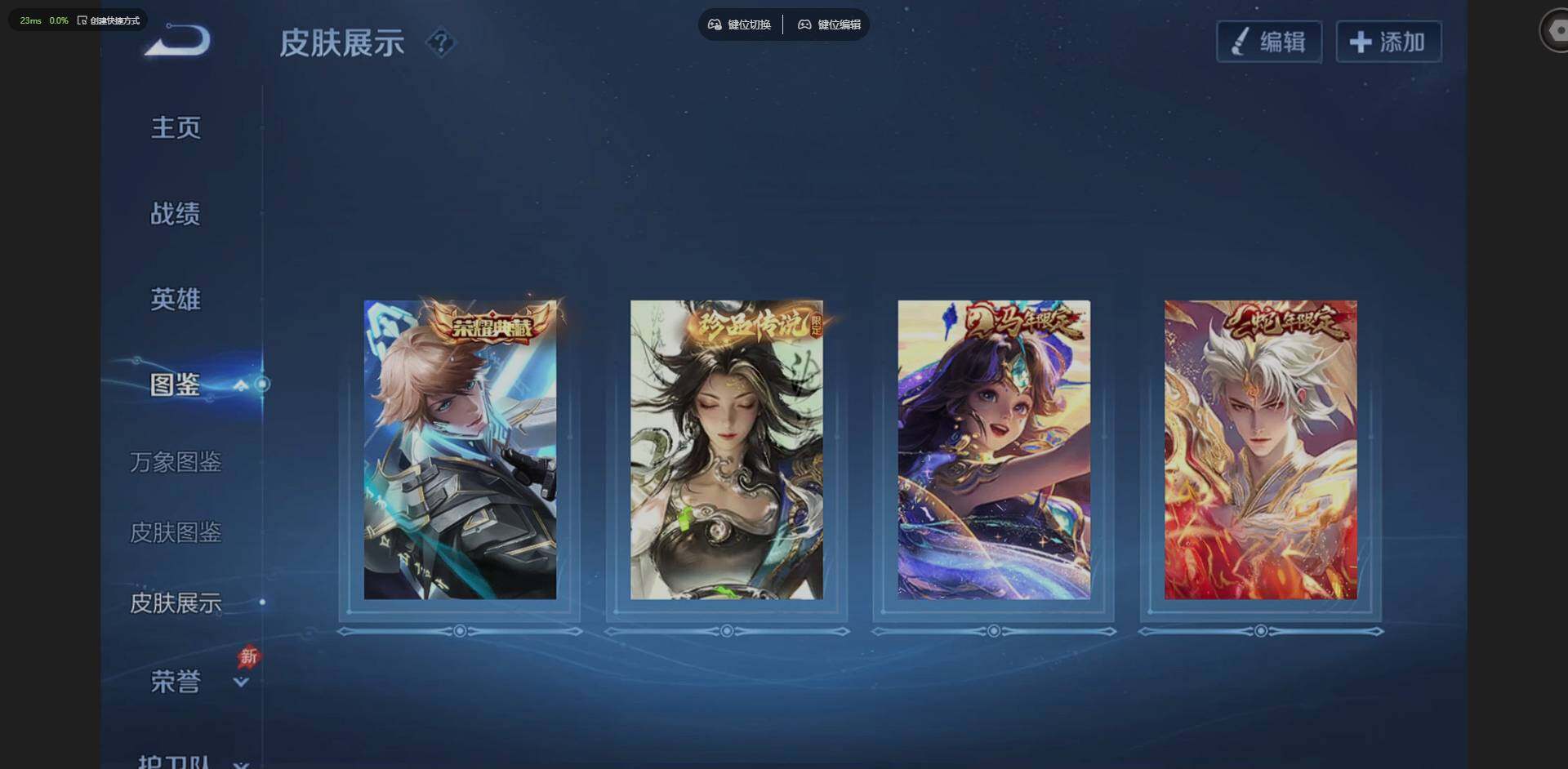 62245/贵族等级: V7 英雄数: 129 皮肤数: 172 荣耀水晶: 鸣剑·曳影 珍品传说: 沧流箭 星传说: 幽冥之眼 传说皮: 地狱之眼,澜逐花归海,幻光神枪,神树通天,神骥·鸣幻洲 限定皮: 李小龙,鸣野蒿,愿照·九州拓