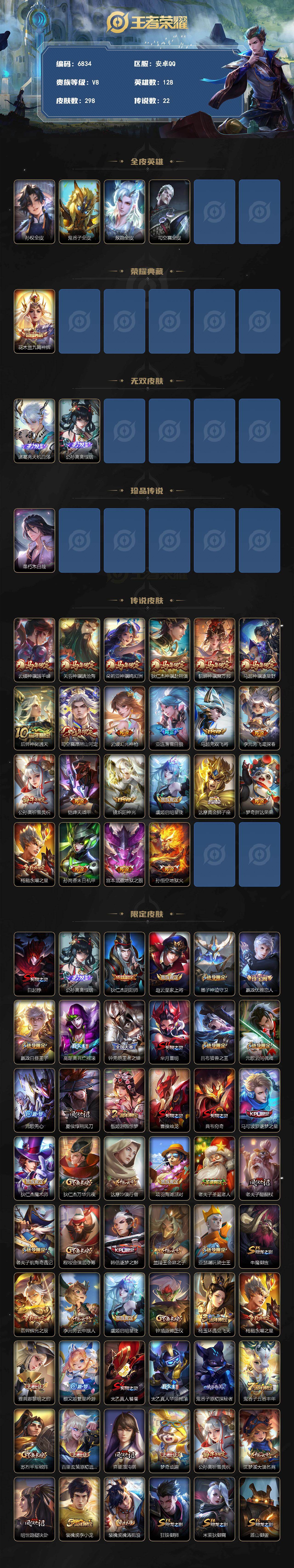 可二次 9000孙尚香 金标黄忠 贵族8-298皮1典藏22传说2无双1珍品传说 安卓手Q520区298皮1典藏22传说2无双1珍品传说V8