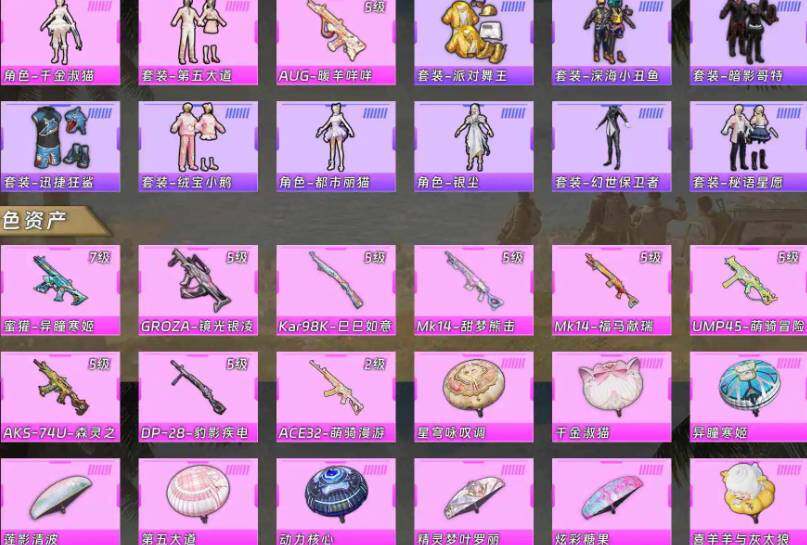 【粉色枪皮等级】:GROZA-镜光银凌(五级),AUG-暖羊咩咩(五级),蜜獾-异瞳寒姬(七级),ACE32-萌骑漫游(二级),UMP45-萌骑冒险(五级),AKS-74U-森灵之息(五级),Kar98K-巳巳如意(五级),Mk14-甜梦熊击(五级),Mk14-福马献瑞(五级),DP-28-豹影疾电(五级)