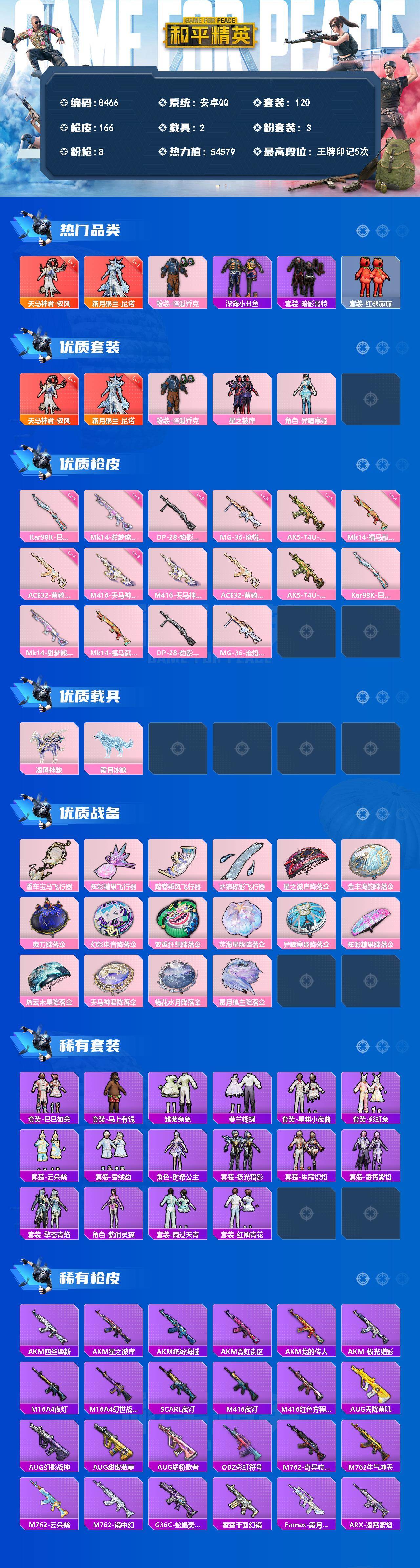 【8466】2神装-3粉装-8特效枪-2载具-5粉色飞行器-54579热力值-5王牌印记-120套装-166枪皮