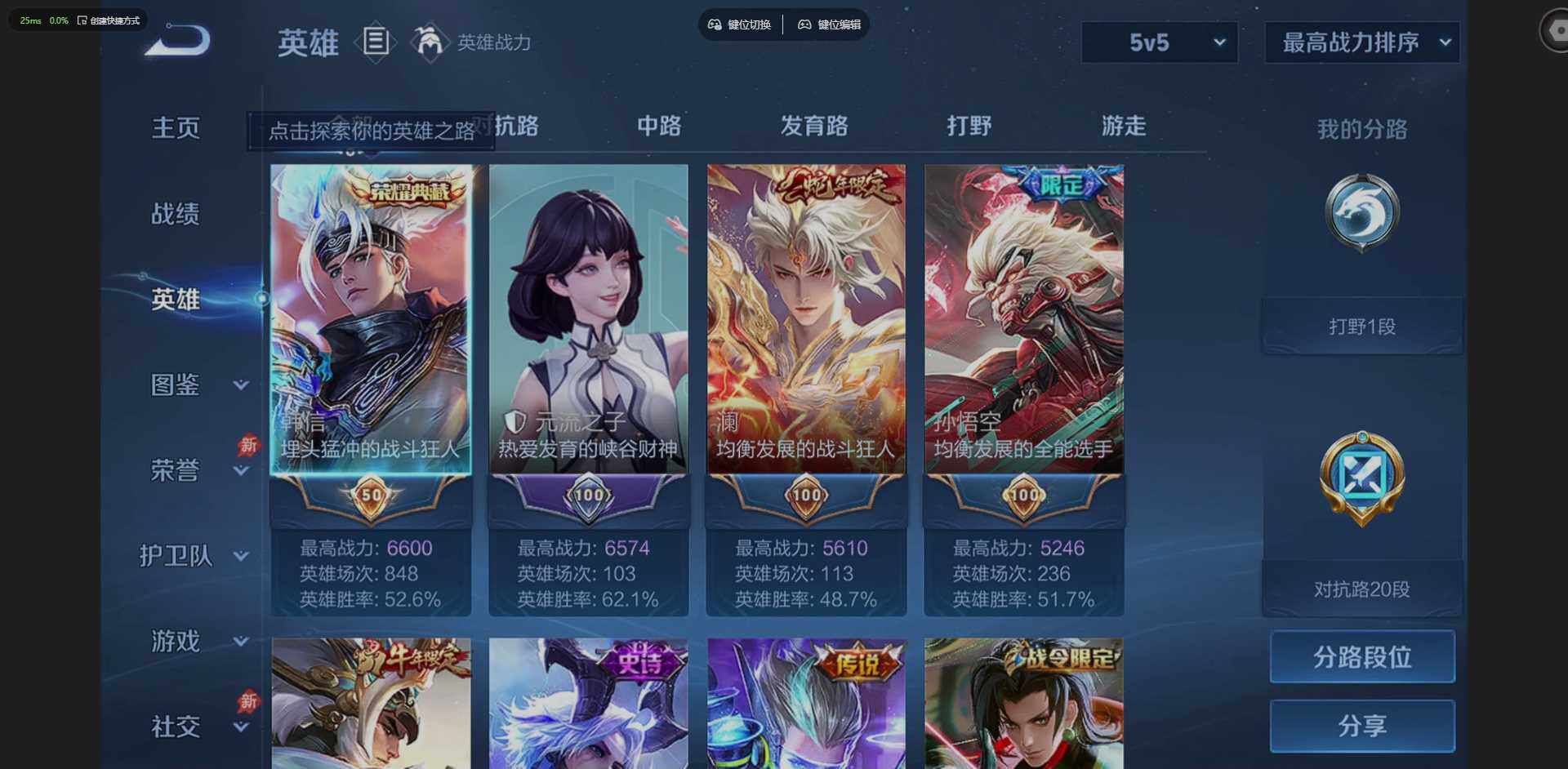 实名: 可修改 贵族等级: V6 英雄数: 127 皮肤数: 202 荣耀水晶