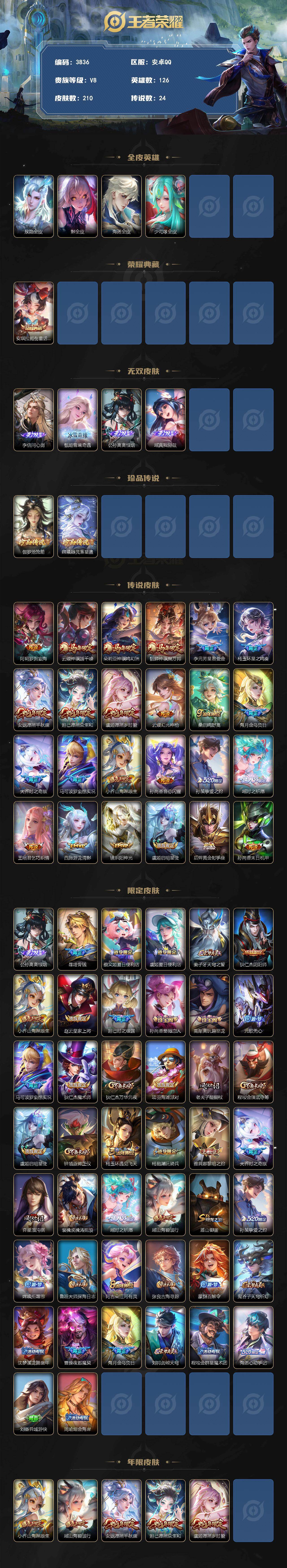 安卓Q-V8-最强王者段位-126英雄-210皮肤-1典藏皮肤-4无双-2珍品传说-24传说-59史诗