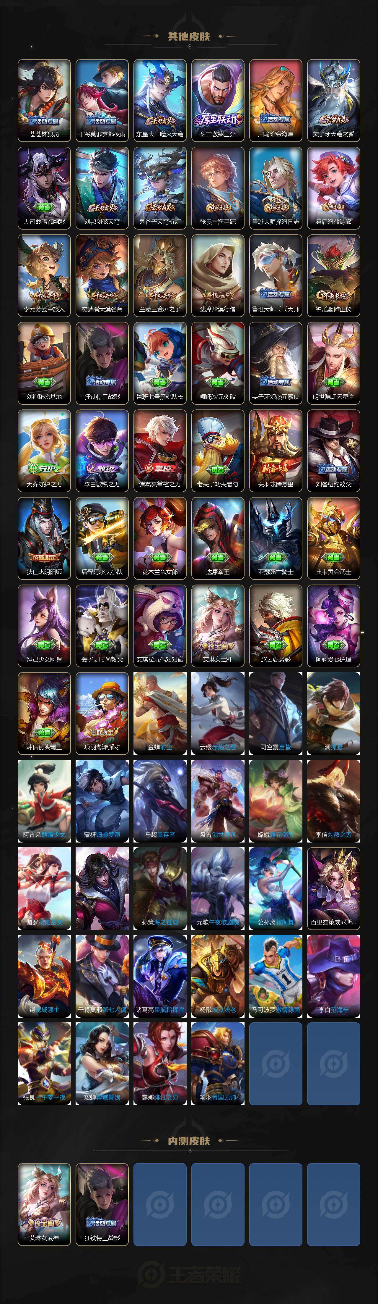 【限定皮肤】:姜子牙天穹之誓,狄仁杰阴阳师,赵云皇家上将,马可波罗妄想实况,达摩沙漠行僧,项羽海滩派对,兰陵王金庭之子,