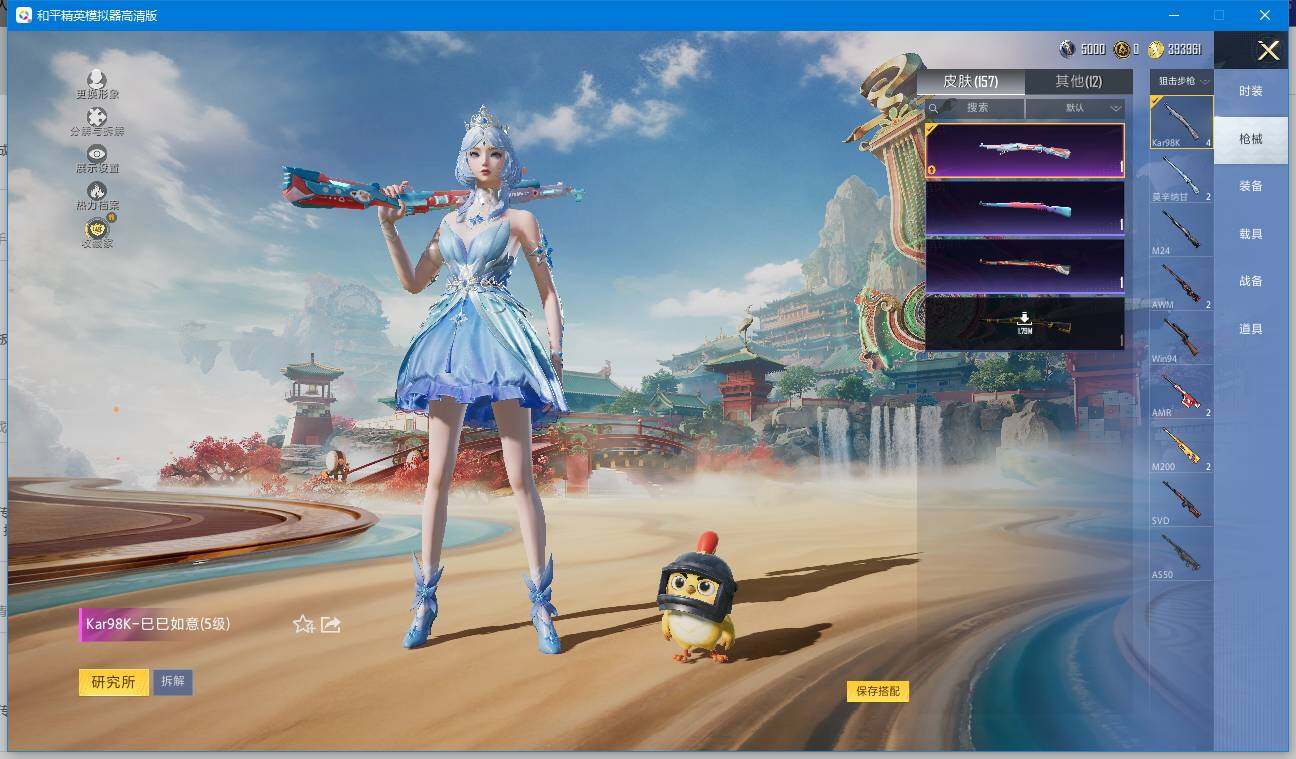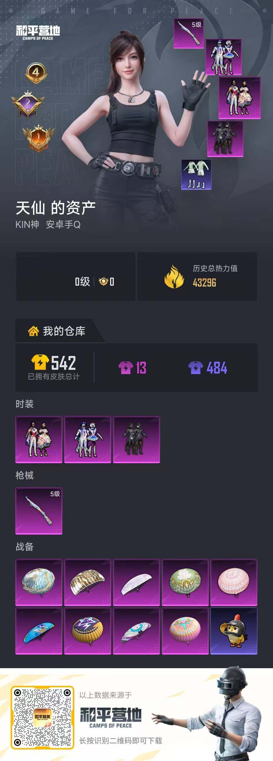 时装数: 563 枪械数: 157 战备数: 94 热门装扮: 古堡领主,深海小丑鱼,星空之魅,星穹咏叹调 稀有枪皮: Kar98K-巳巳如意(五级)