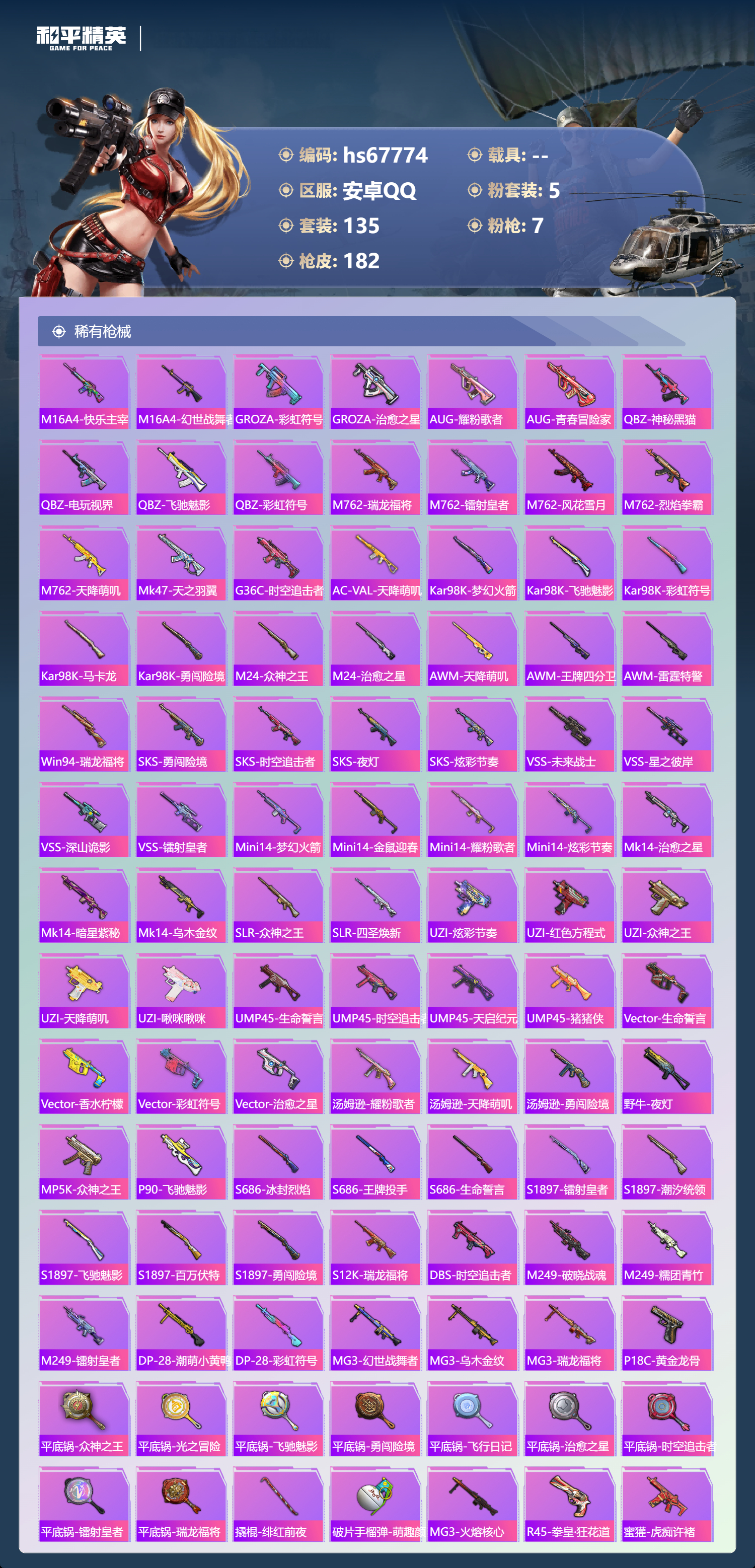 hs67774 安卓手Q-6王牌印记-5粉装-7特效枪-55401热力值-135套装-182枪皮-1卓越印记