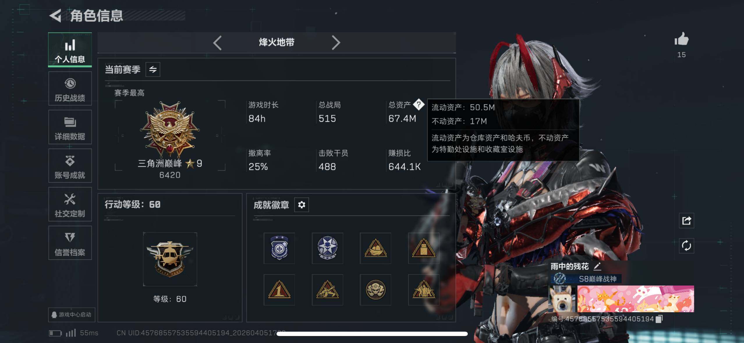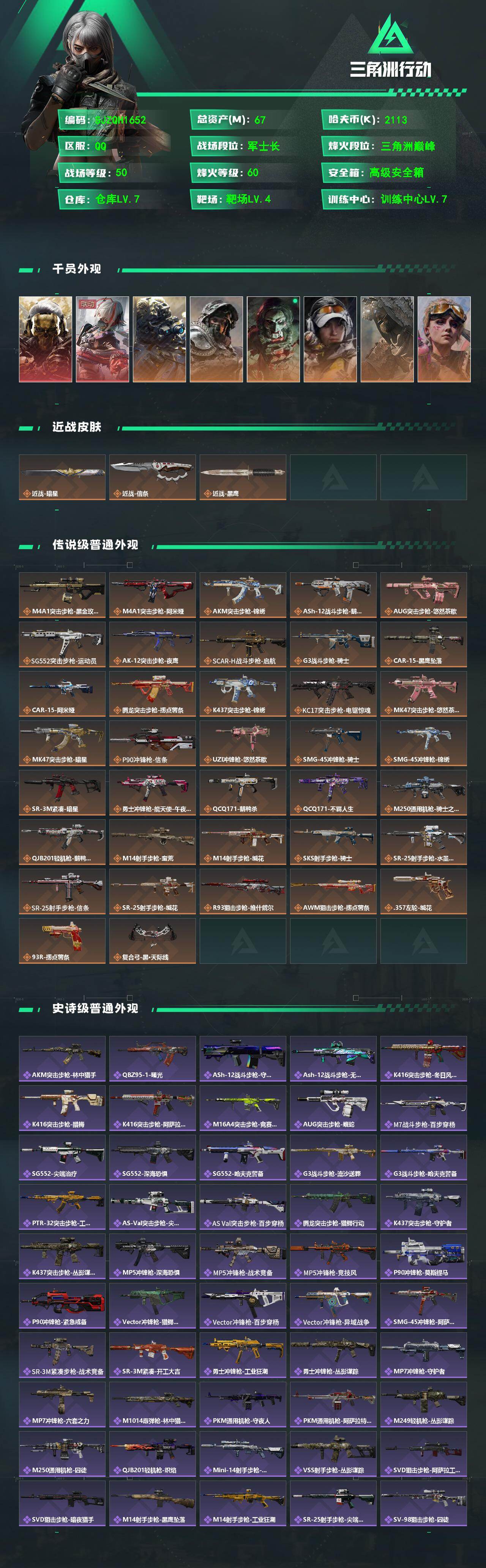 【SJZQH1652】总资产(M):67M/哈夫币(K):2113K/哈夫币(K):2113K/传说枪皮数:37/全面战场等级:50_段位:军士长/烽火地带等级:60_段位:三角洲巅峰/红狼-蚀金玫瑰/骇爪-维什戴尔/无名-夜鹰/深蓝-不破誓约/红狼-电锯惊魂/露娜-金牌射手/乌鲁鲁-荒原猎手/蛊-不羁人生/近战-暗星/近战-信条/近战-黑鹰/M4A1突击步枪-蚀金玫瑰/M4A1突击步枪-阿米娅/AKM突击步枪-锦绣/ASh-12战斗步枪-鹅鸭杀/AUG突击步枪-悠然茶歇/SG552突击步枪-运