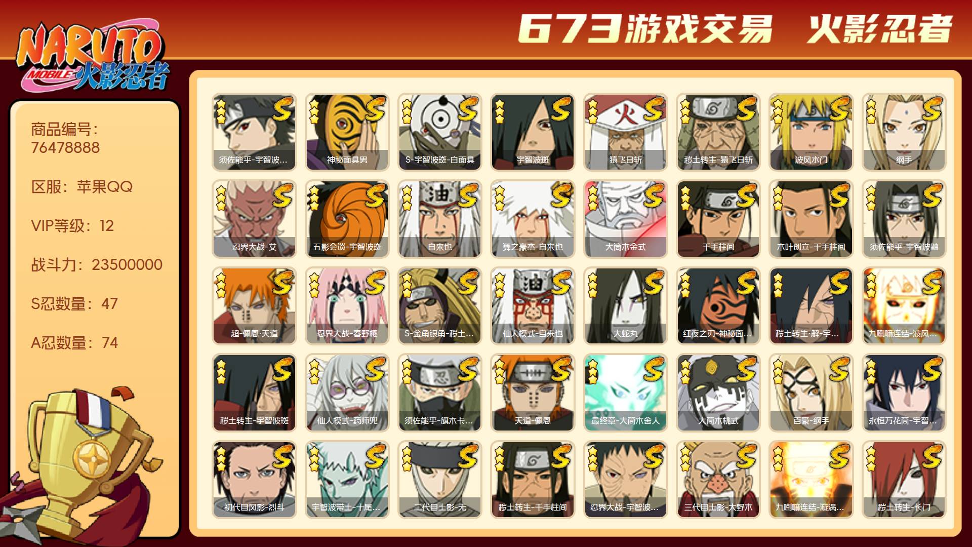 角色等级162 金币1 战斗力23500000 S忍47 A忍74 5星S忍者44 12 段位上忍