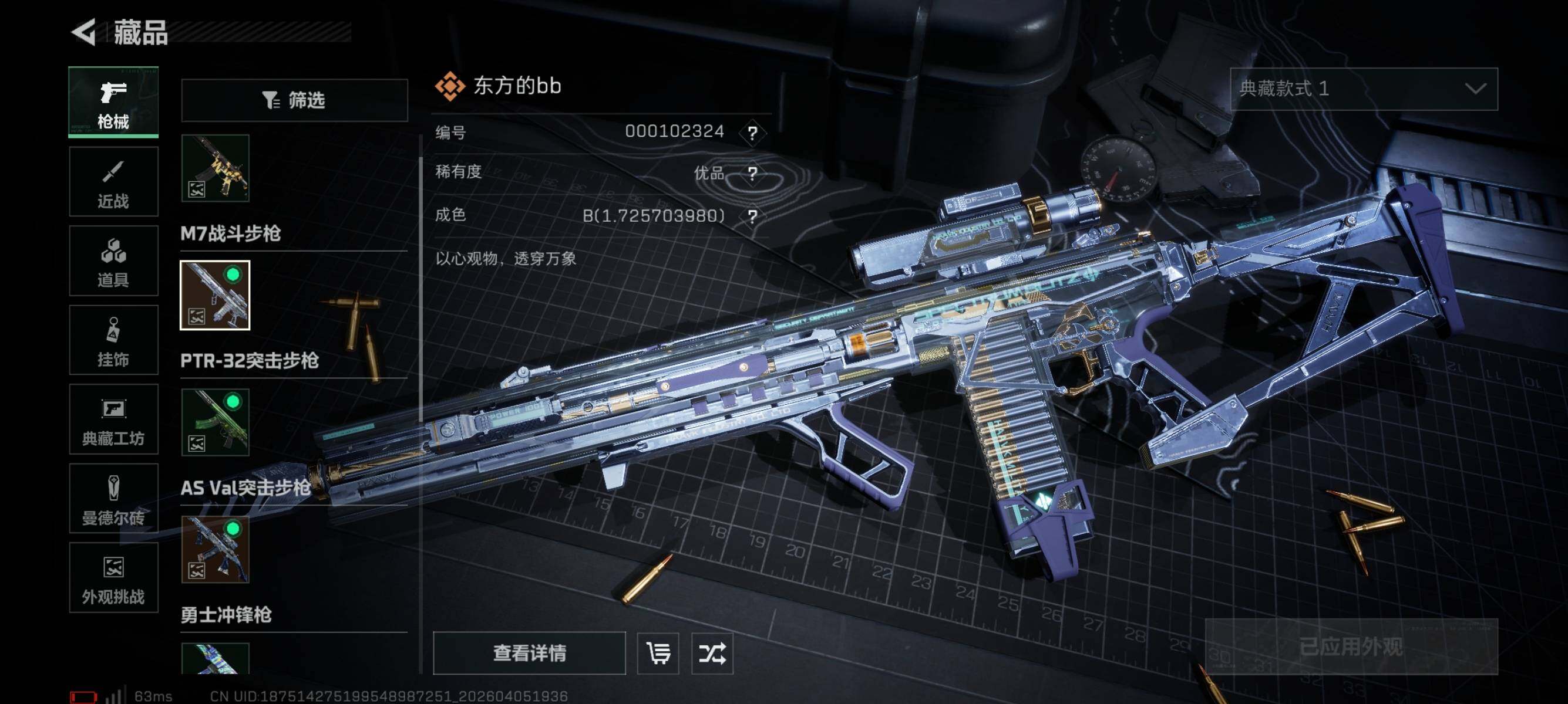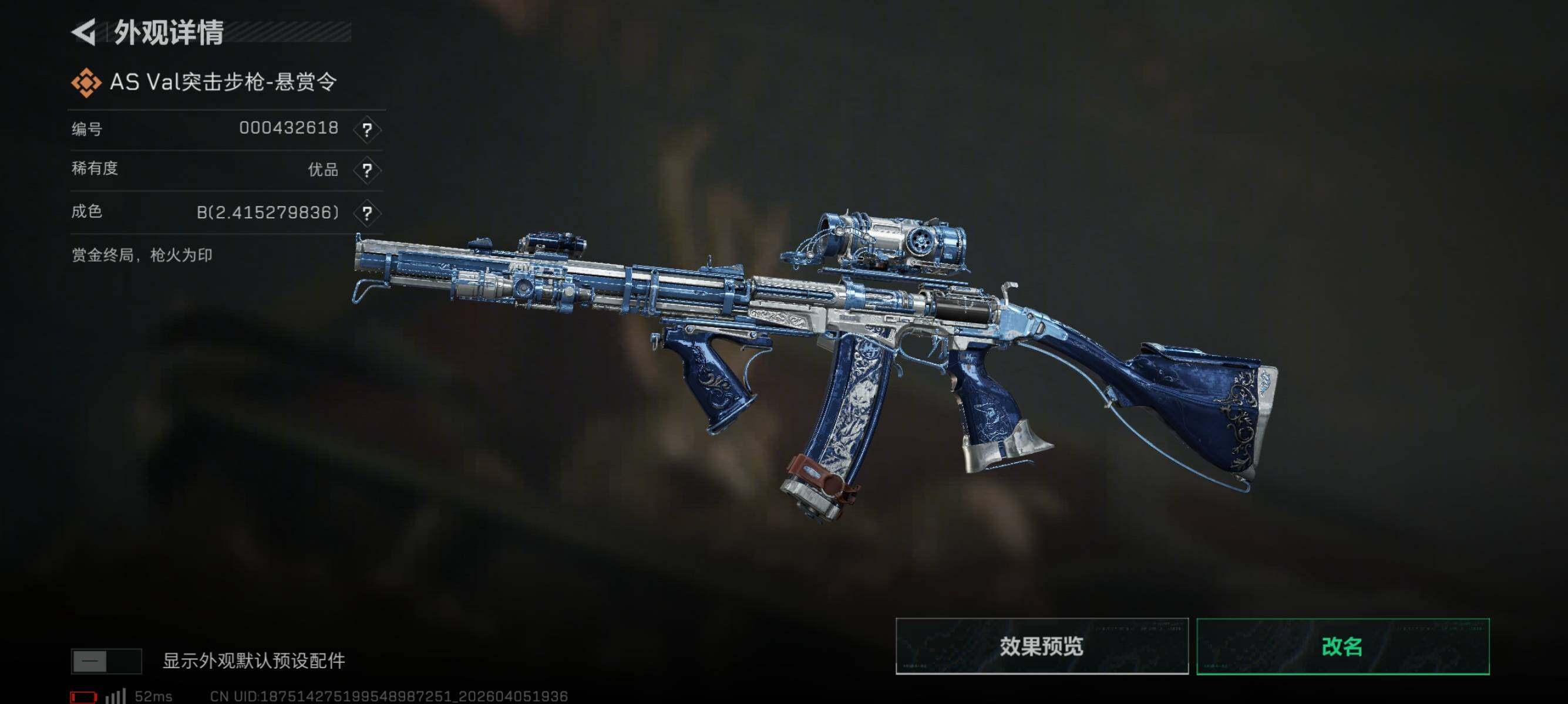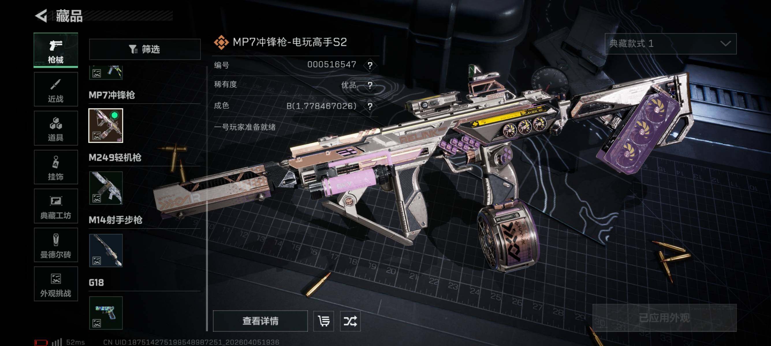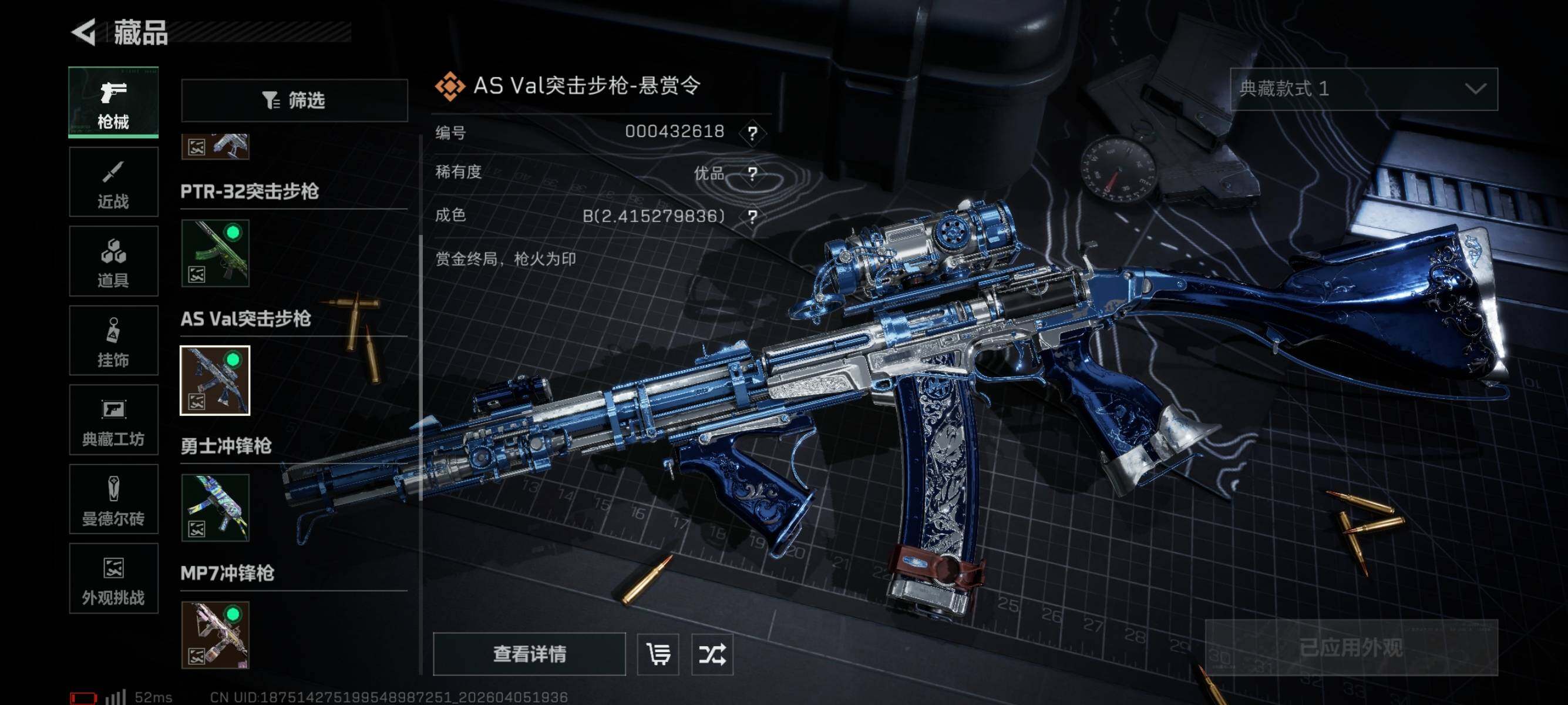 【典藏外观成色】:M7战斗步枪-棱镜攻势S2(优品B),AS Val突击步枪-悬赏令(优品B),MP7冲锋枪-电玩高手S2(优品B)