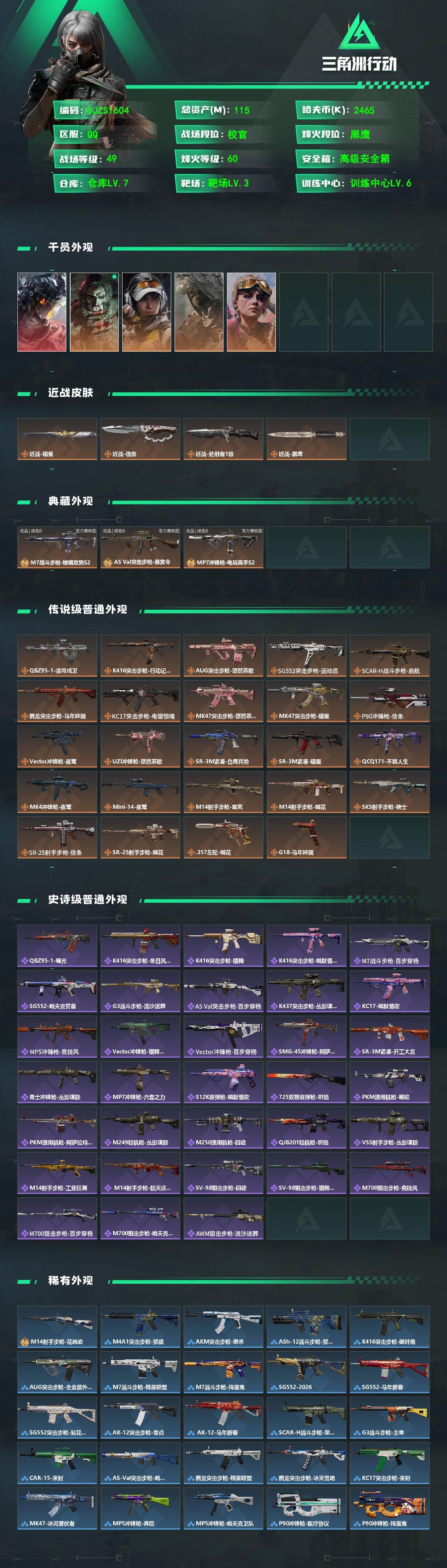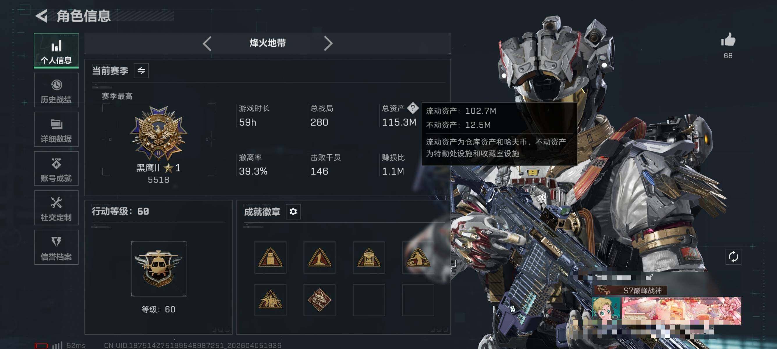 115m总资产-2465k哈夫币-60烽火等级-黑鹰-49战场等级-校官