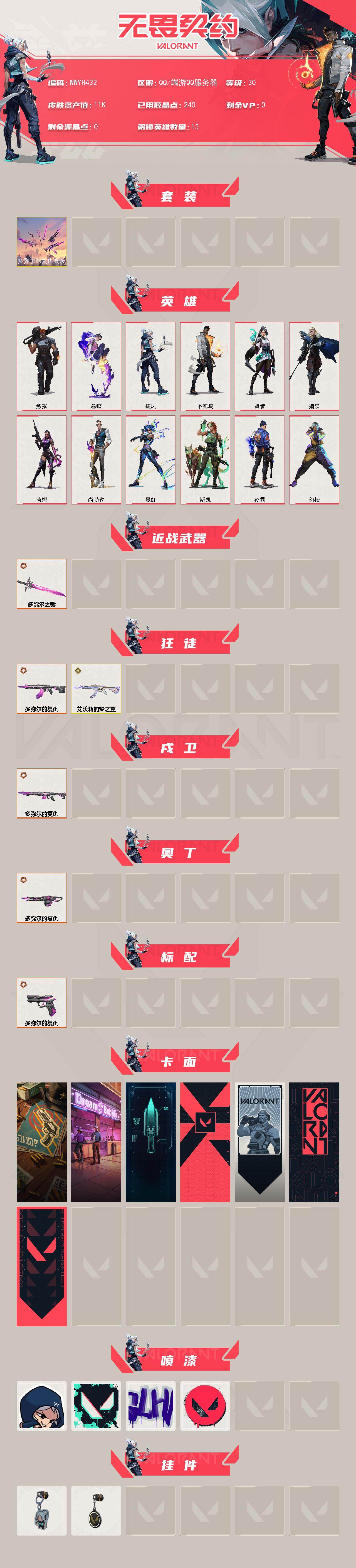 【WWYH432】终极*5/传奇*1/皮肤*19/等级*30/段位:未定级/多弥尔的复仇套装/幻棱/炼狱/暮蝶/捷风/不死鸟/贤者/猎枭/芮娜/尚勃勒/霓虹/斯凯/夜露/近战武器-多弥尔之裁/狂徒-多弥尔的复仇/狂徒-艾沃莉的梦之翼/戍卫-多弥尔的复仇/奥丁-多弥尔的复仇/标配-多弥尔的复仇/正义的化身 卡面/梦幻奶茶 卡面/零点嗅探设计图 卡面/代号红色 卡面/新兵报到 卡面/V契约 卡面/无畏契约 卡面/捷风差距 喷漆/胜利属于无畏契约 喷漆/GLHF 喷漆/无畏契约 喷漆/袖珍捷风 挂饰/