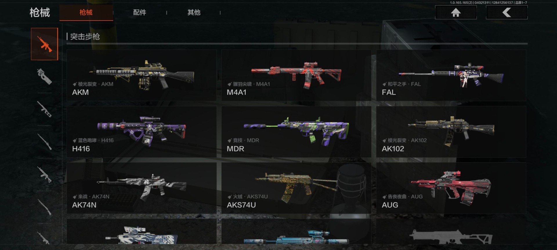 【紫色枪皮】典礼武备·MK14,典礼武备·M249,粉绒臻选·AN94,棱光裂变·AKM,竞技·MDR,鱼跃丹青·T85,骤羽尖啸·M4A1,利齿风暴·T79,战术大师·SJ16,宝石籽料·MPX,棱