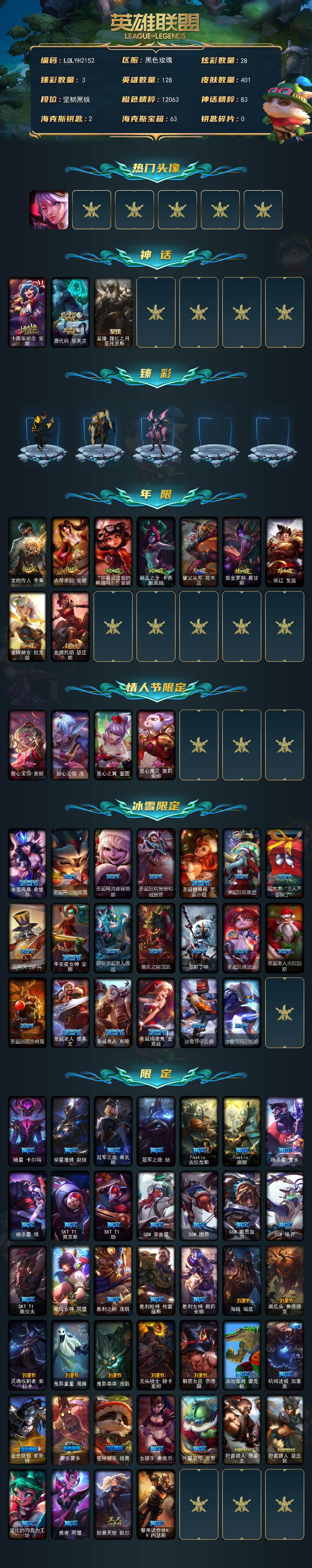 未定级段位-128英雄-401皮肤-28炫彩-0终极-3神话-72限定-34传说-96史诗