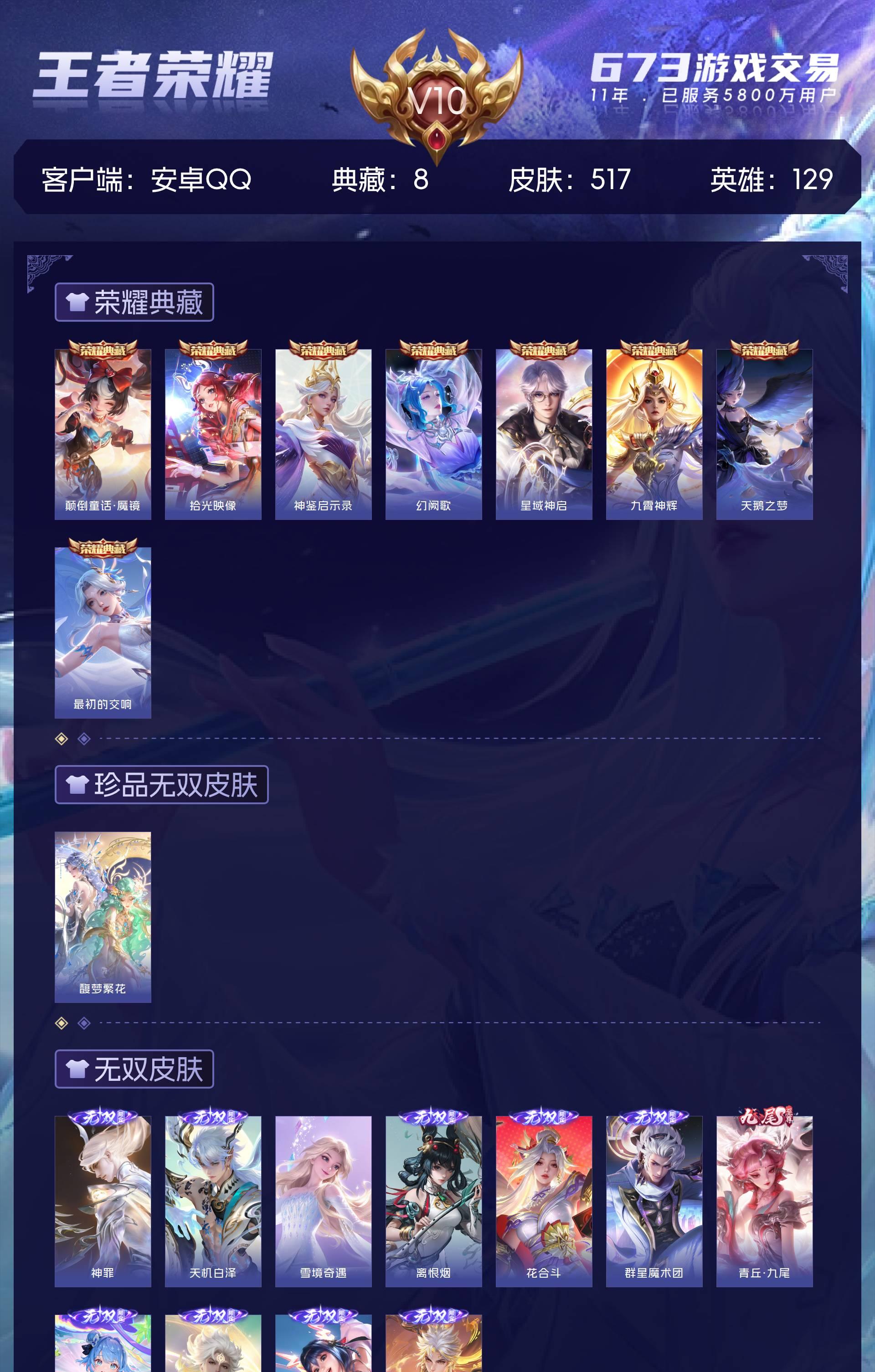 V10 皮肤517 英雄129 荣耀王者 荣耀典藏8 珍品无双1 无双皮肤11 珍品传说10 星传说2 传说70