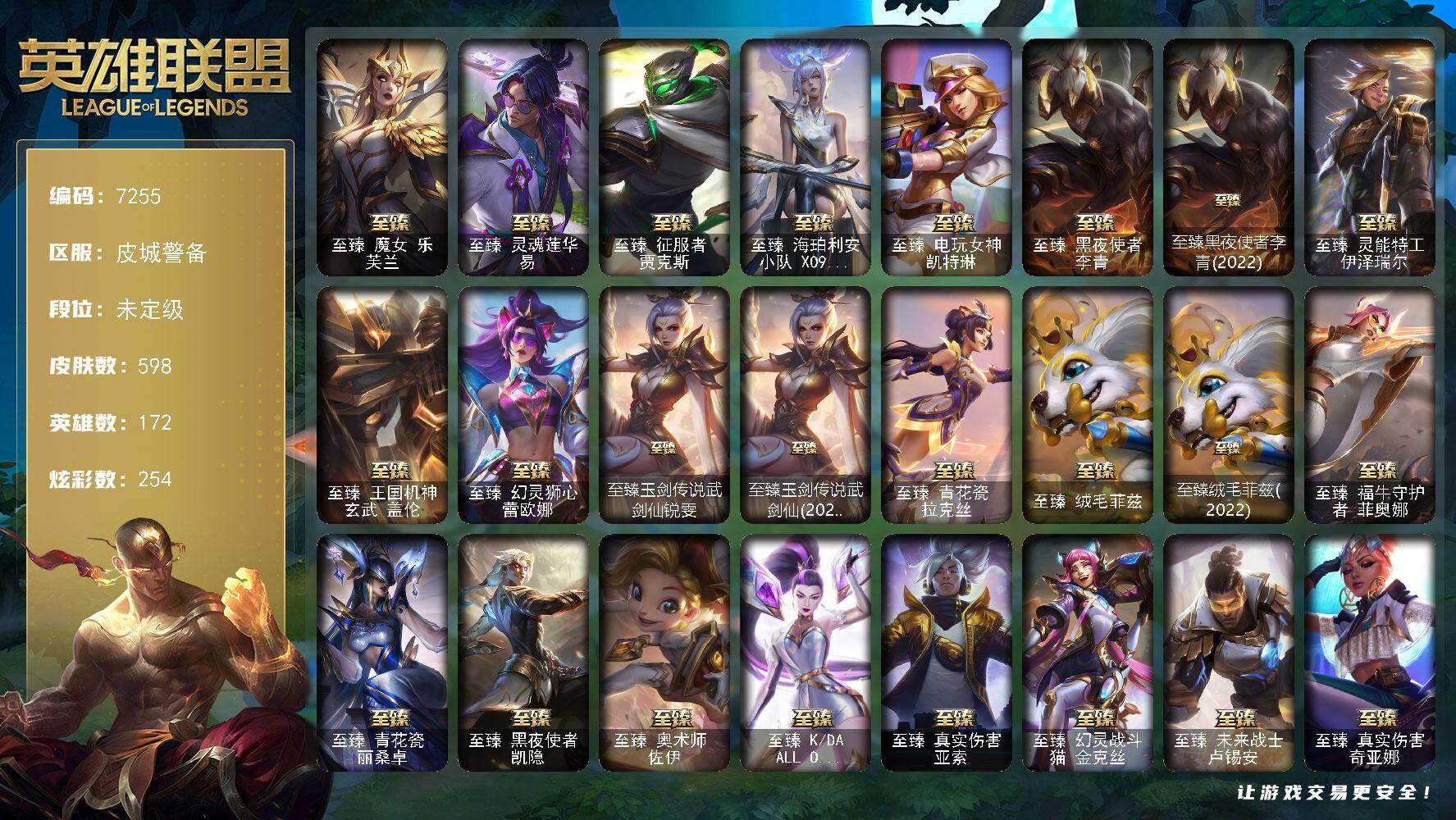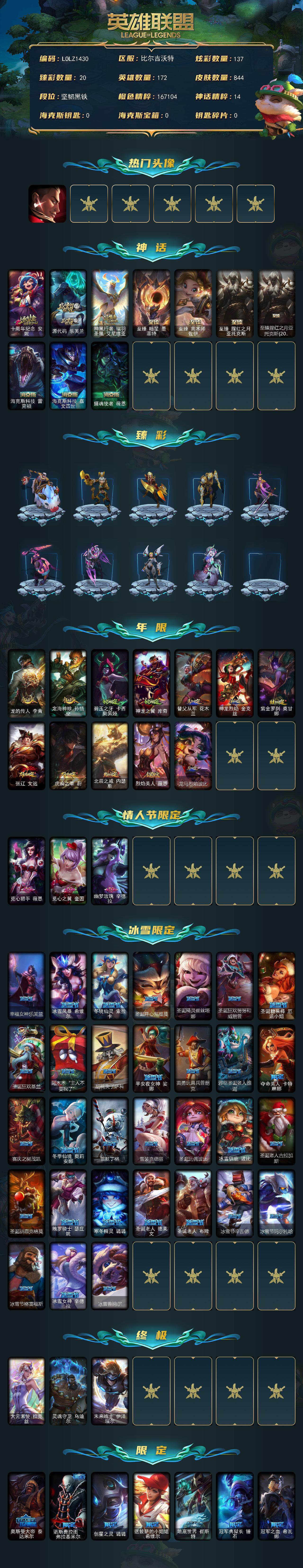 【LOLZ1430】172英雄/844皮肤/3终极/10神话/153限定/20臻彩/137炫彩/65传说/205史诗/未定级/觅心游侠卢锡安头像/十周年纪念安妮/源代码乐芙兰/神凰行者瑞羽圣凰艾尼维亚/至臻暗星墨菲特/至臻奥术师佐伊/至臻腥红之月亚托克斯/至臻腥红之月亚托克斯(2022)/海克斯科技雷克顿/海克斯科技嘉文四世/摄魂使者薇恩/剪纸仙灵嘉文四世日进斗金/天龙之子卡莎飞龙乘云/无畏骑士瑟庄妮赤子初心/替父从军花木兰炫金龙刃/墨之影武者亚索金墨耀影/征服者韦鲁斯炫金/冠军之隐劫凯旋圣装/