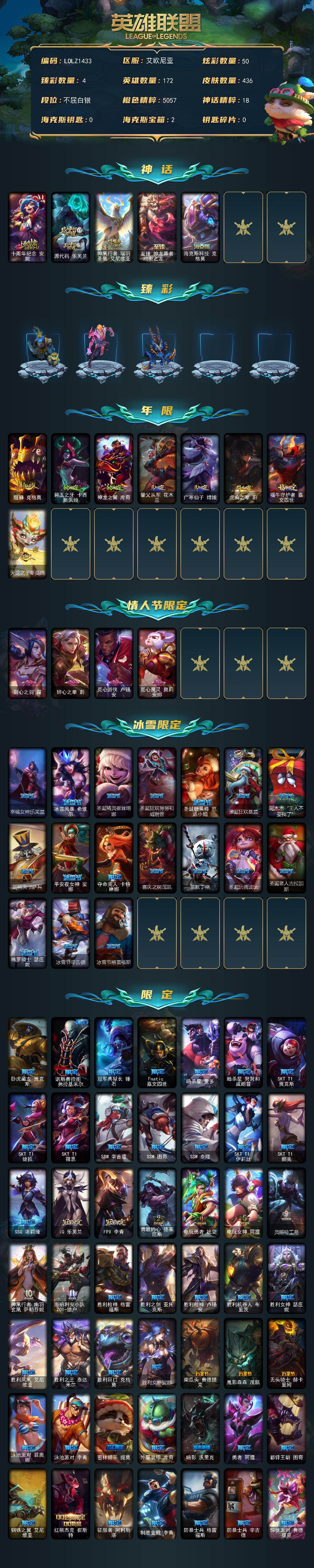【LOLZ1433】172英雄/436皮肤/5神话/81限定/4臻彩/50炫彩/44传说/91史诗/白银/十周年纪念安妮/源代码乐芙兰/神凰行者瑞羽圣凰艾尼维亚/至臻神龙尊者均衡之龙沃利贝尔/海克斯科技克格莫/冠军典狱长锤石凯旋圣装/神龙尊者圣龙李青登龙/霸天异形卡兹克掠空魅影/红莲之刃锐雯/醒狮克格莫/碧玉之牙卡西奥佩娅/神龙之翼库奇/替父从军花木兰/广寒仙子嫦娥/虎痴之拳蔚/福牛守护者嘉文四世/天龙之子斯莫德/甜心之羽霞/碎心之拳蔚/觅心游侠卢锡安/觅心魔灵奥莉安娜/幸福女神乐芙兰/冰雪风暴