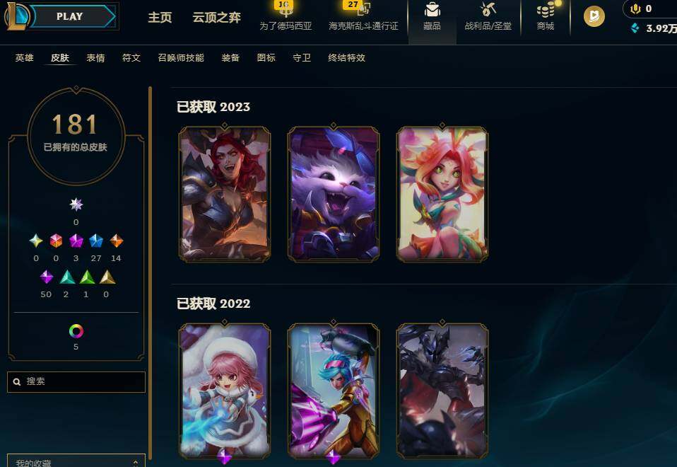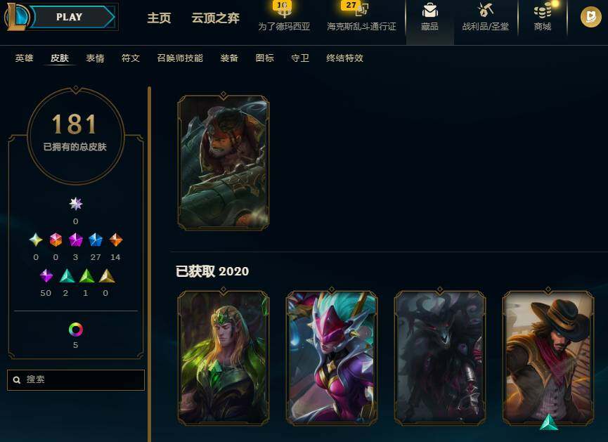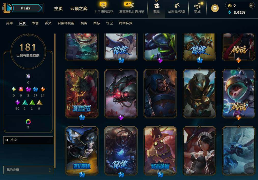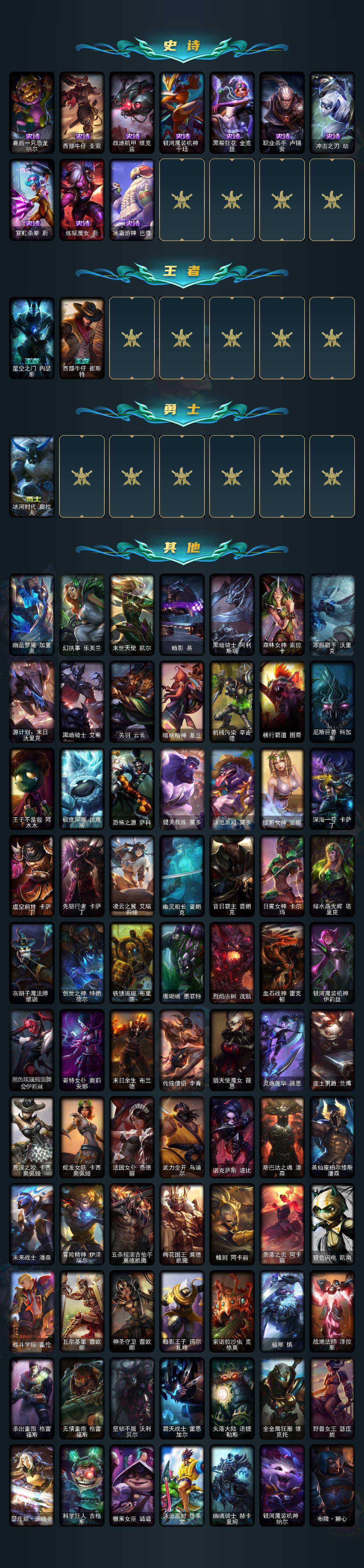 167英雄/181皮肤/3神话/27限定/1臻彩/6炫彩/14传