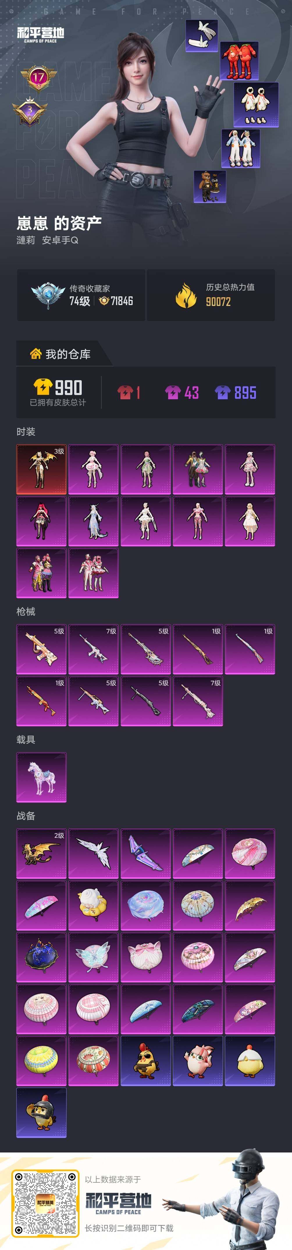 【特价出售/店主推荐】安卓 手Q-1神装-11粉装-9特效枪-1载具-3粉色飞行器-90072热力值-17王牌印记-190套装-266枪皮【红色神装等级】:圣域龙灵-瑞拉(三级)【热门品类】:粉装-缤纷油彩,套装-龟仙人,套装-浪漫波比,角色-8号机,套装-红熊茄茄【粉色套装】:粉装-蝶舞迷情,粉装-缤纷油彩,粉装-馨动时刻,角色-小叽联名款,角色-守护天翼,角色-千金淑猫,角色-幻海仙踪,角色-绯穹魔姬,角色-奇迹舞步 美雪,角色-花灵,角色-羊梦糖心【粉色枪皮等级】:M16A4-晶梦幻蝶(七