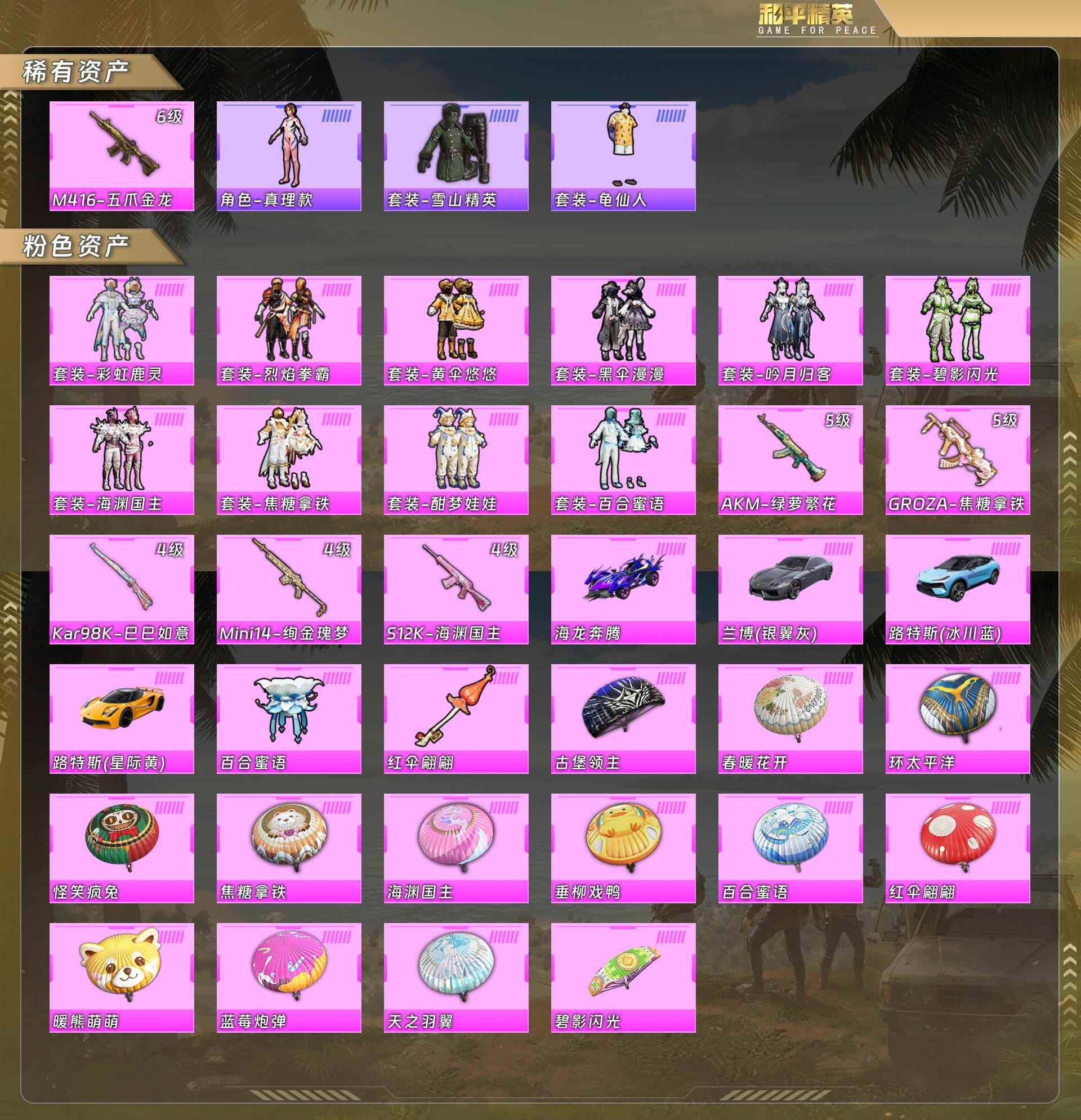 (10粉套6粉枪4载具)真理款战斗服/老六服/彩虹鹿灵/烈焰拳霸/黄伞悠悠/黑伞漫漫/吟月归客/碧影闪光/海渊国主/焦糖拿铁/酣梦娃娃/百合蜜语【枪皮】M4五爪金龙6级/AKM绿萝繁花5级/GROZA焦糖拿铁5级/98K巳巳如意4级/Mini14绚金瑰梦4级/S12K海渊国主4级【载具】海龙奔腾/兰博基尼(银翼灰)/路特斯(冰川蓝)/路特斯(星际黄) 没战神框 HP4363-2粉色飞行器-59843热力值-5王牌印记-126套装-160枪皮
