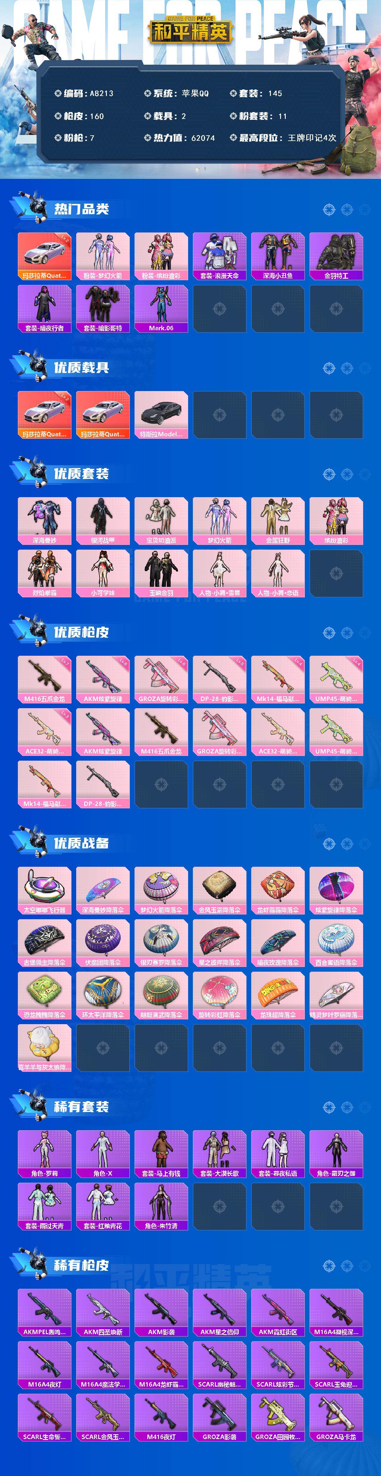 【A8213】[苹果 精品小号 手Q-11粉装-7特效枪-2载具-1粉色飞行器-62074热力值-4王牌印记-145套装-160枪皮 梦幻火箭 红眼罩 蓝螳螂 M416-五爪金龙(七级) AKM-炫紫旋律(六级) 玛莎拉蒂Quattroporte(幻星粉)(二级) ]
