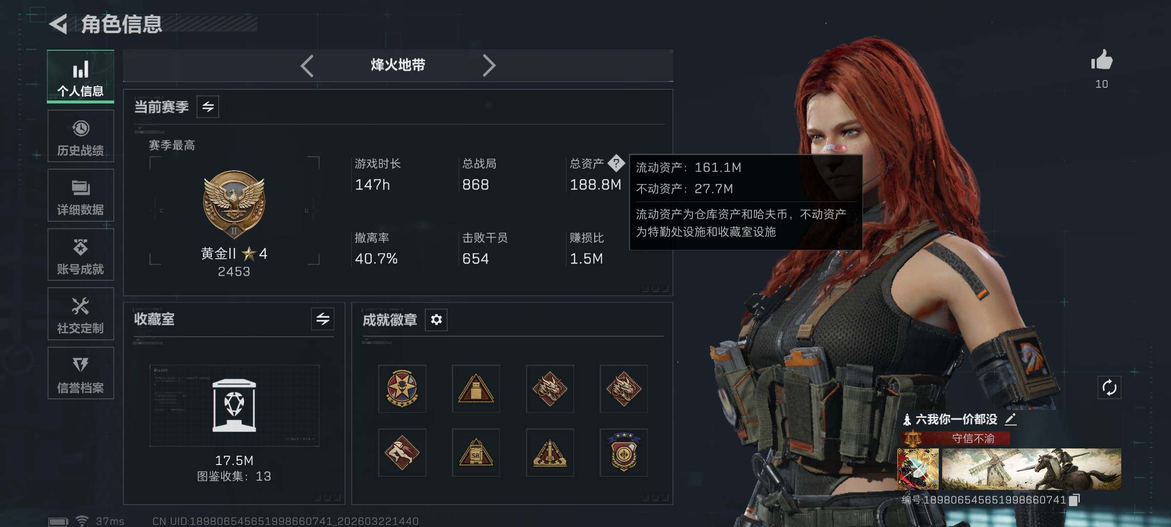 总资产(M):189M/哈夫币(K):51018K/传说枪皮数:32/全面战场等级:27_段位:上等兵/烽火地带等级:60_段位:黄金/