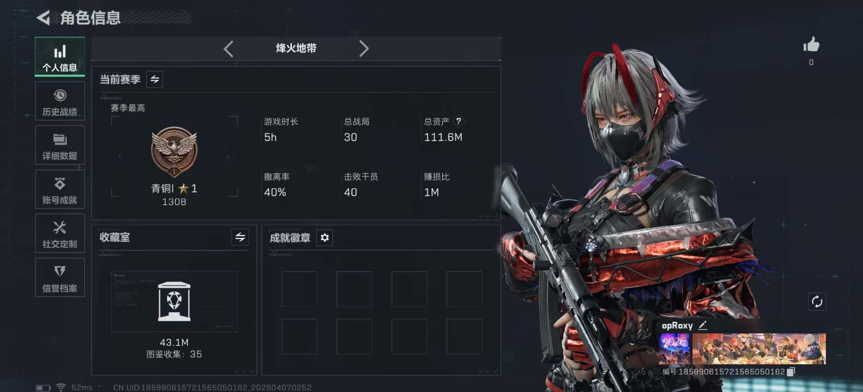 111m总资产-1039k哈夫币-60烽火等级-青铜-15战场等级-列兵【干