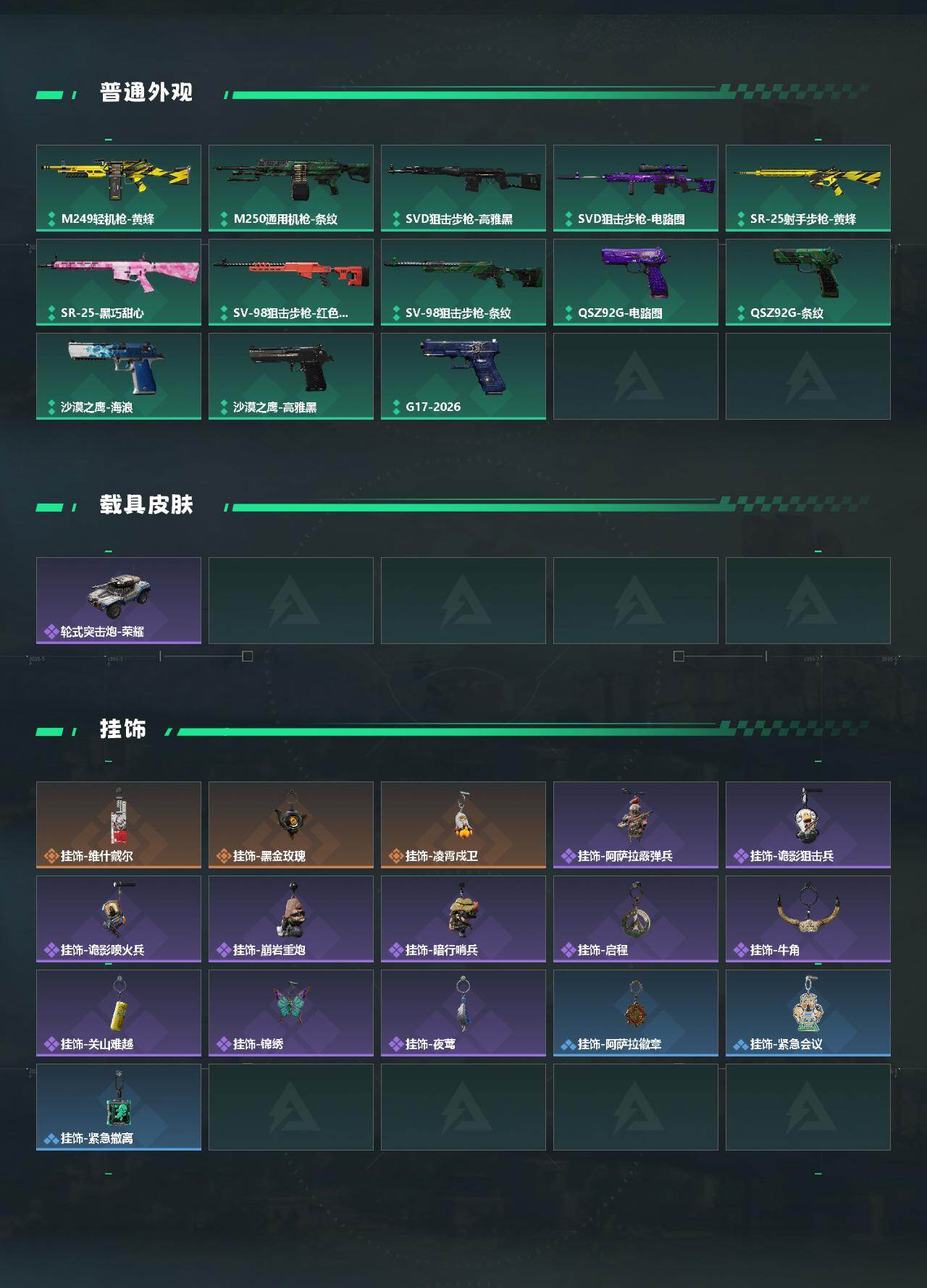 【传说外观】:M4A1突击步枪-阿米娅,AKM突击步枪-锦绣,SCAR-H战斗步枪-启航,G3战斗步枪-骑士,K437突击步枪-锦绣,KC17突击步枪-电锯惊魂,SMG-45冲锋枪-锦绣,M250通用机枪-骑士之心,R93狙击步枪-维什戴尔