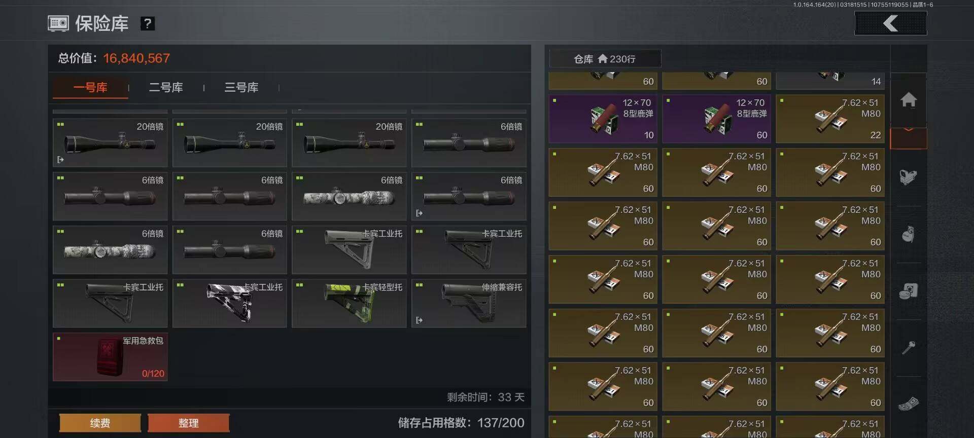 【AQZG1773】等级:30/段位:暗区传说/仓库价值(百万):113.7/柯恩币:10000000/急袭弯刀/S-07折刀/赢家匕首/冥河/深潜行者II/套金客莫雷尔